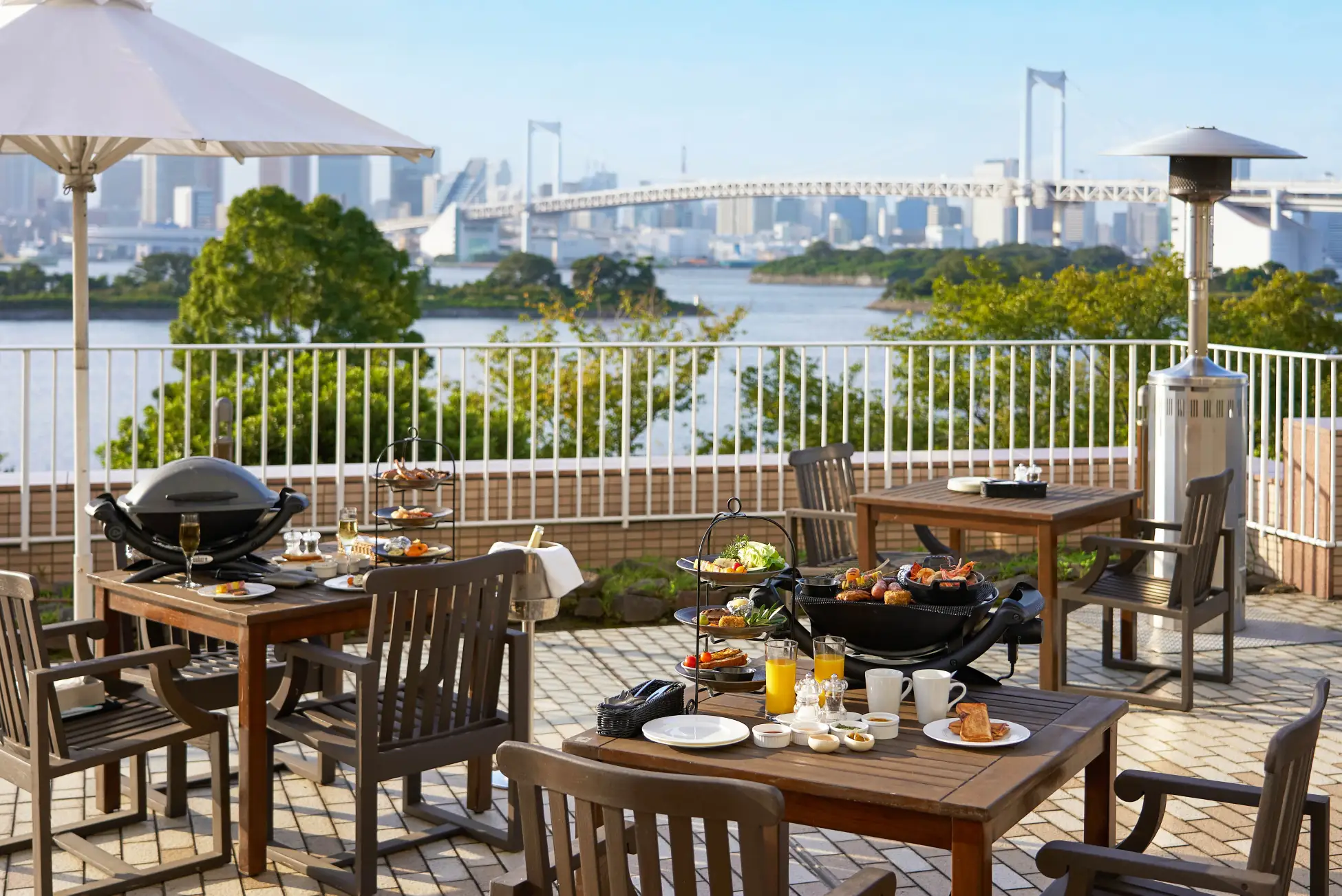ヒルトン東京お台場2階のテラスエリアに位置する「アブレイズ」は、レインボーブリッジや東京タワーなど、東京湾のパノラマビューが眼前に広がる絶好のロケーションが特長です。刻々と表情を変える空と潮風に包まれながら、開放感あふれるアウトドアダイニングをお楽しみいただけます。