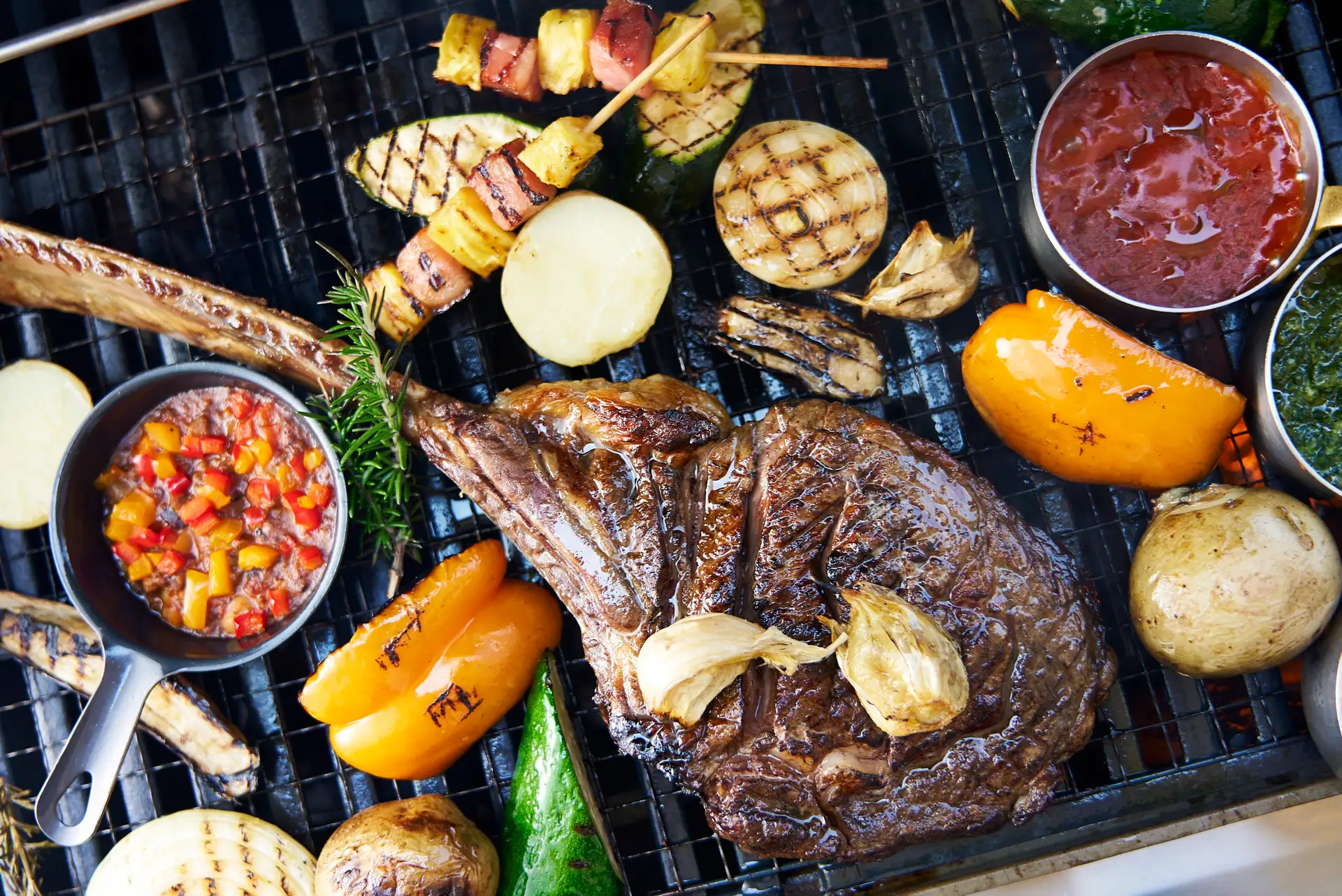 オーストラリア産ビーフ リブアイ 150g / 骨付き鶏モモ肉のタンドリースパイス / ビッグソーセージ /シーフードプラッター(有頭海老、イカ、 ハマグリ)/ 焼き野菜 / ミックスグリーンサラダ / マンゴーシェーブアイス