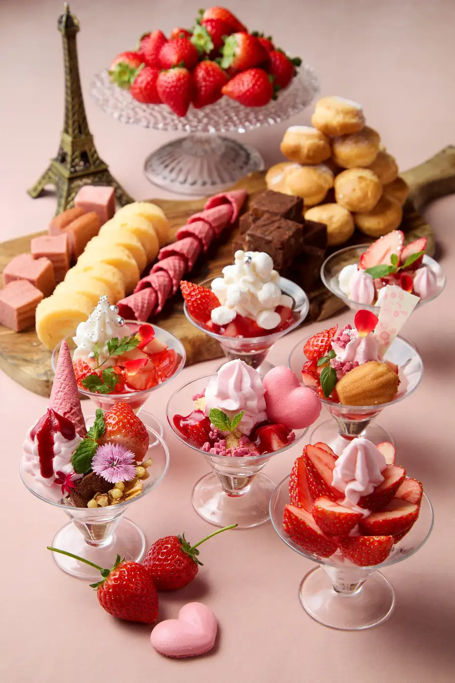 あまおういちごミルクやルビーチョコレートフォンデュ、甘酸っぱい旬のいちごを使ったデザートに加え、いちごを主役に自分だけのパルフェを仕立てる“体験型スイーツ工房”が登場します。