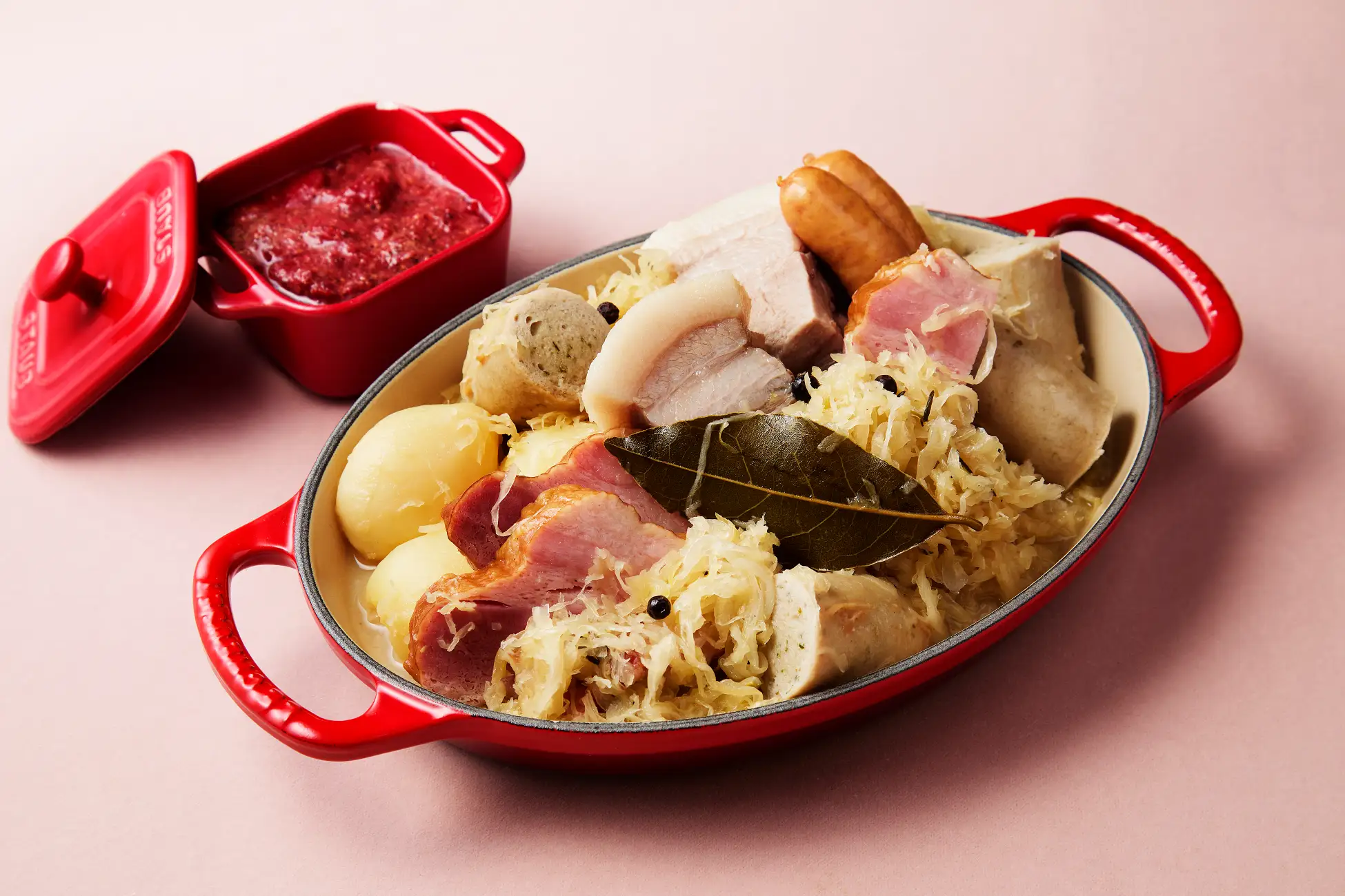 フランスで人気の前菜「フランス産生ハムといちごのサラダ」や、特性のストロベリーマスタードをアクセントに、キャベツやソーセージ、ジャガイモなどをじっくり煮込んだ温かな一皿「シュークルート」など、地域の個性が光るメニューが並びます。