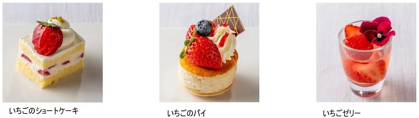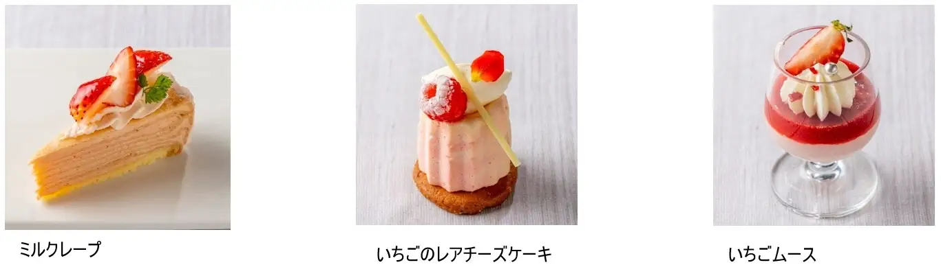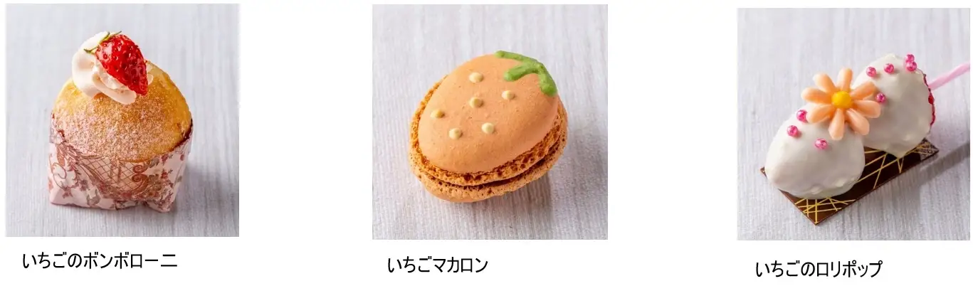 いちごのショートケーキ、いちごのパイ、いちごゼリー、いちごムース、ミルクレープ、いちごのレアチーズケーキ、いちごマカロン、いちごのボンボローニ、いちごのロリポップ