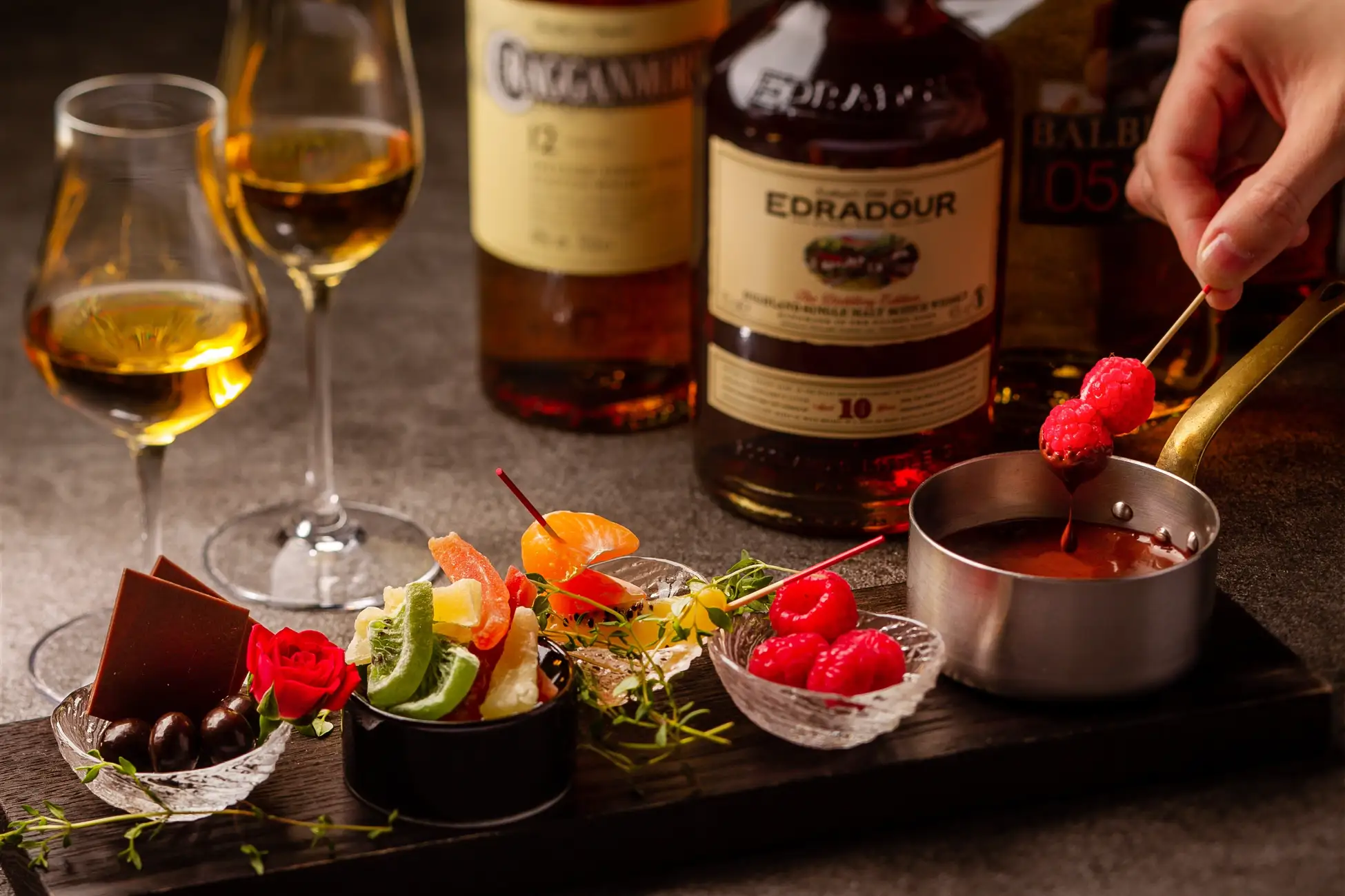 バレンタインデーに向けた宿泊プランでは、バー「VIEW BAR」オリジナルのチョコレートフォンデュ(「Melty Black」または「Melty White」)とドリンクをセットで用意します。バーテンダーが目の前でソースに香りづけのフランベを施し、おふたりの夜をより印象深く演出します。カカオの風味豊かなダークチョコレートのソース「Melty Black」には香ばしさを引き立てるバーボンを、なめらかで優しいテイストのホワイトチョコレートのソース「Melty White」には、甘さをより深めるアップルブランデーのカルバドスで香りづけします。フルーツやスナックをフォンデュして召し上がりください。ドリンクは、フルーツを使った6種類のカクテルからお好みの1杯をお選びいただけます。