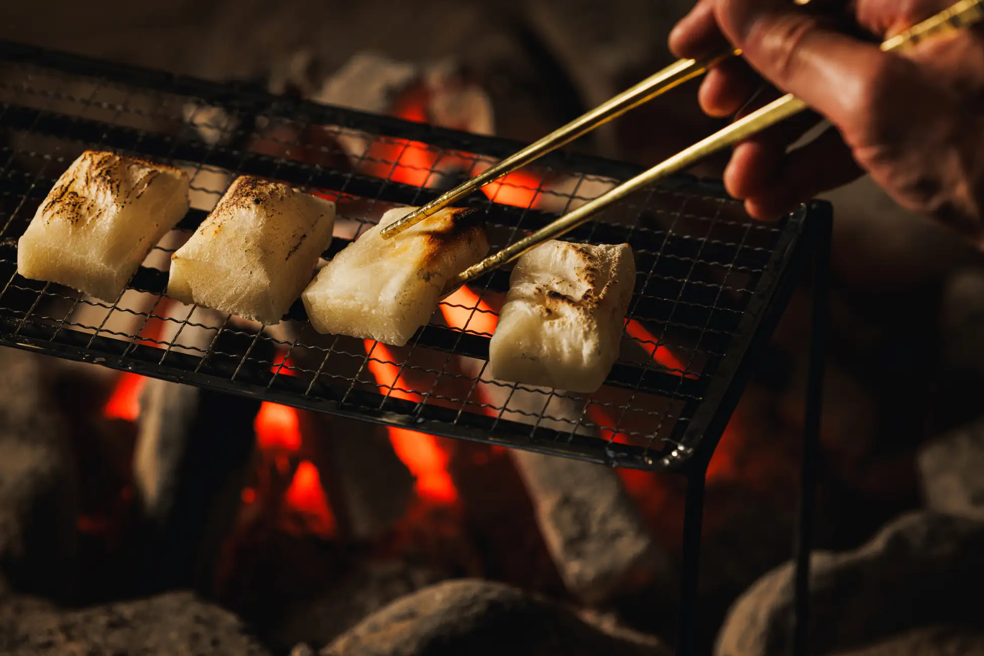 特徴3 囲炉裏の炭火でこんがり焼いたお餅と燗酒
