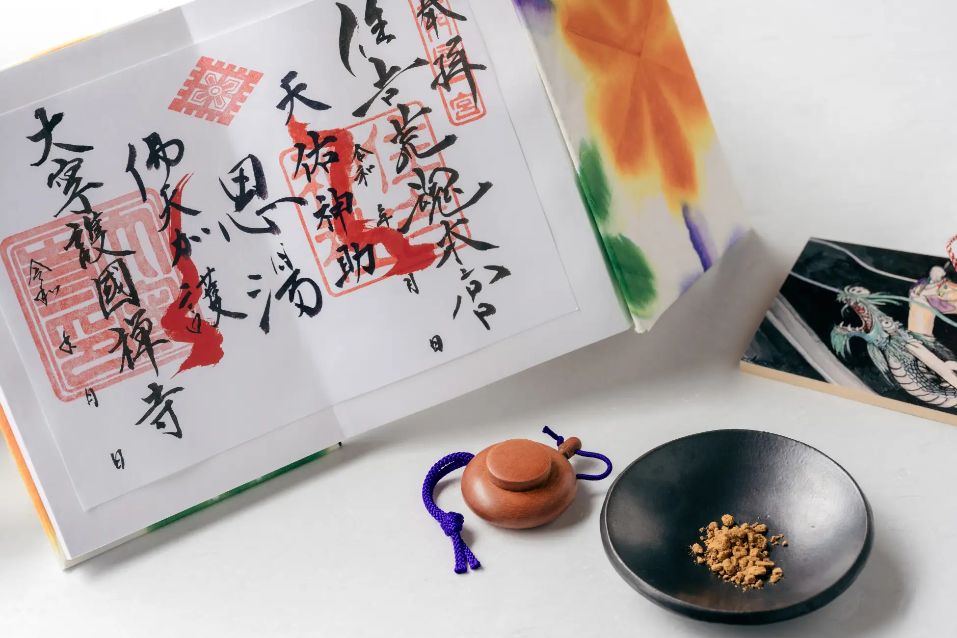 客室では、福を招く準備を整える「ふくふく開運セット」を用意します。セットには、現在数戸しか残存しない山口市無形文化財「徳地和紙」を使用したオリジナルの御朱印帳が含まれます。この御朱印帳には、翌日訪れる「恩湯(おんとう)」や「大寧寺(たいねいじ)」で御朱印をいただくことができます。さらに、身を清めるための塗香(ずこう)や、山口県ならではの日本酒なども揃え、滞在中に心身を清め、運気を高めるお手伝いをします。