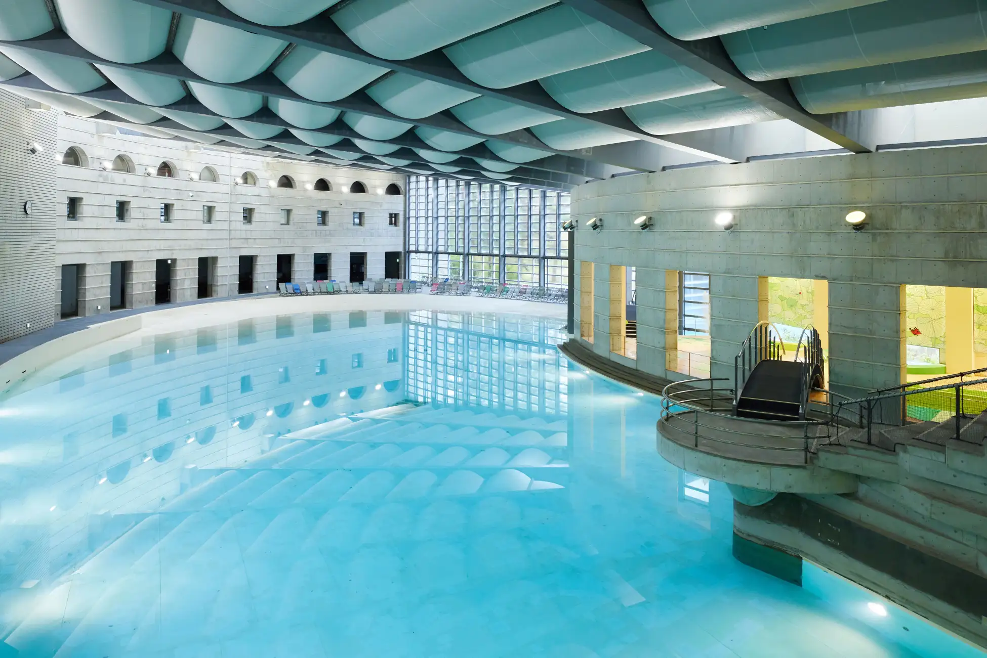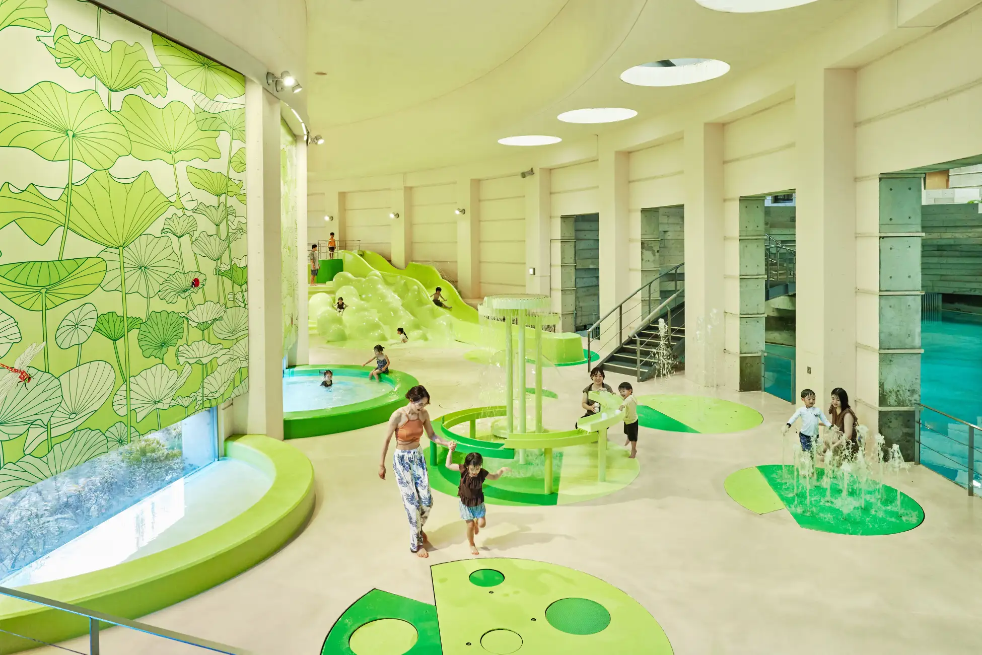 森の中の海をコンセプトにした、季節や天候を気にせず楽しめるプール「il mare」。室内、水温ともに約30℃に保たれており、冬でも快適な空間で楽しめます。波の出るプール、キッズエリア、カフェテリアなどが一体となった開放的な空間です。
