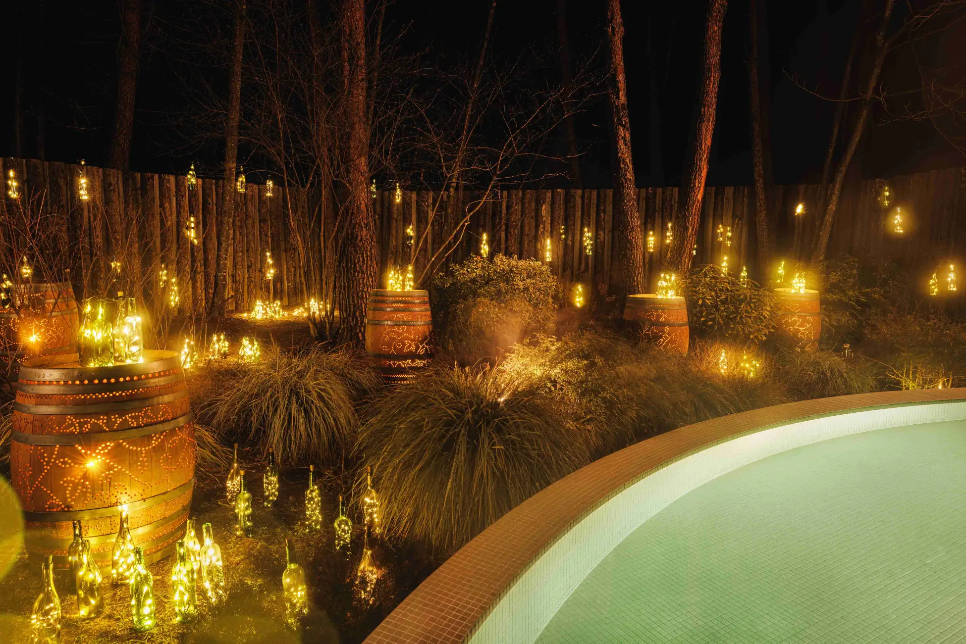 森に抱かれた温浴施設「もくもく湯」の露天エリアでイルミネーションを実施します。満天の星やイルミネーションと共に、特別なナイトバスタイムを提供します。森の静けさと温かな光が揺らめく空間で、ゆったりと疲れを癒す湯浴みのひとときです。