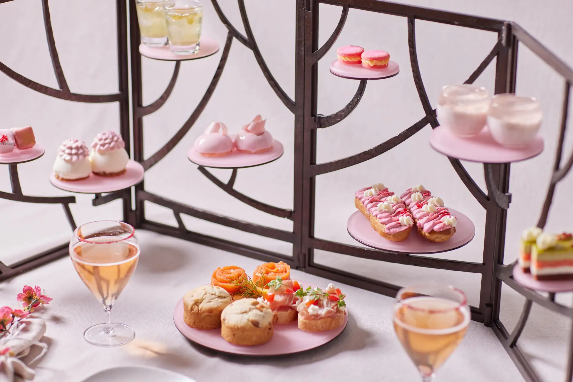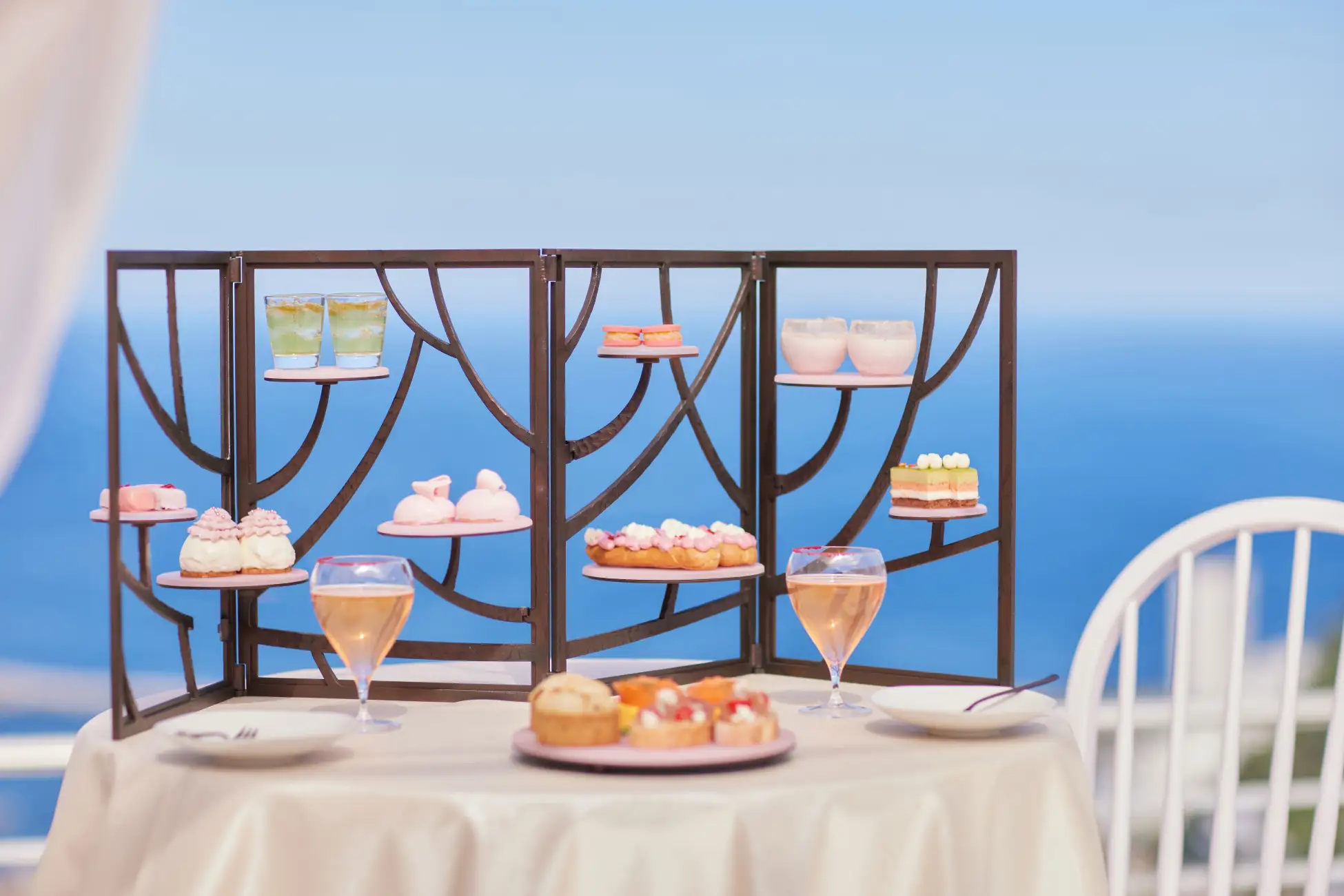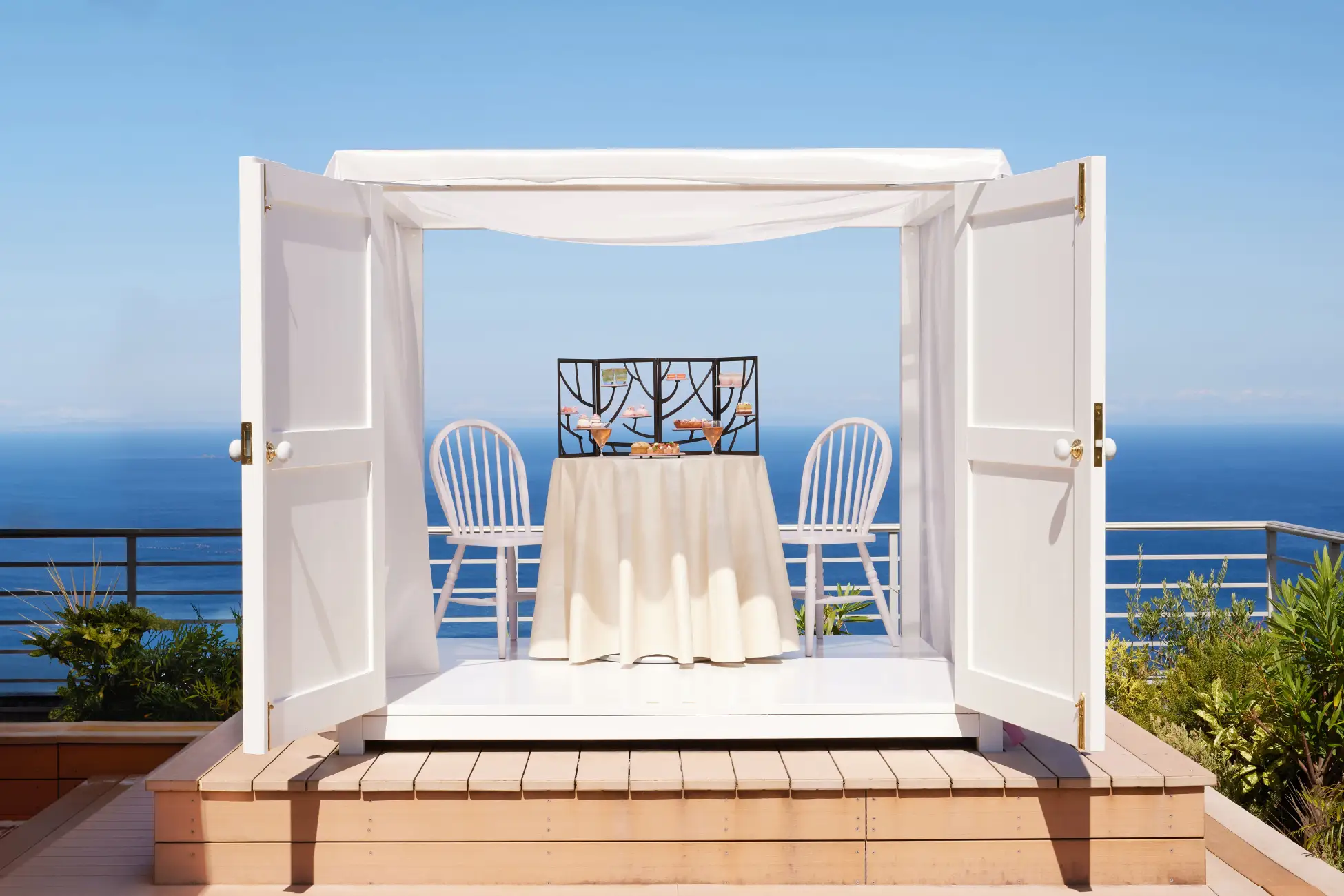 テラス席には、春の訪れを感じられる特等席が登場。白い扉を開けると、そこには淡いピンク色のドレープカーテンに包まれ、華やかに設えられた空間が広がります。目の前の海と街並みを眼下に、アフタヌーンティーを味わいながら少し早い春を感じ、贅沢なひとときを心ゆくまで過ごせます。