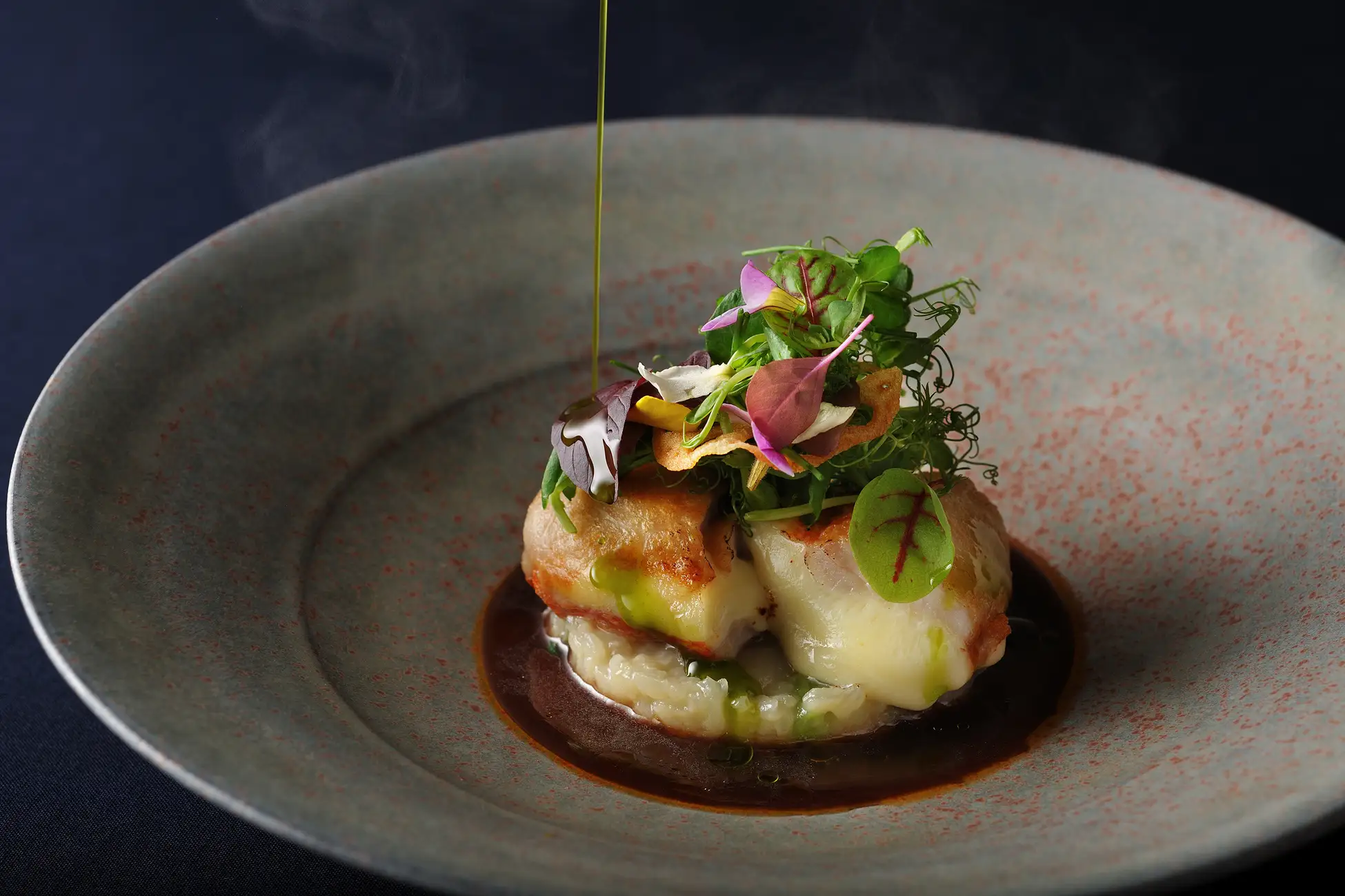 ふぐをイタリア料理の定番カルパッチョに仕立て、仕上げに軽やかな柑橘の泡をかけた一皿。ハーブを合わせることで、てっさだけでは味わえない、これまでにないふぐの楽しみ方を提案します。