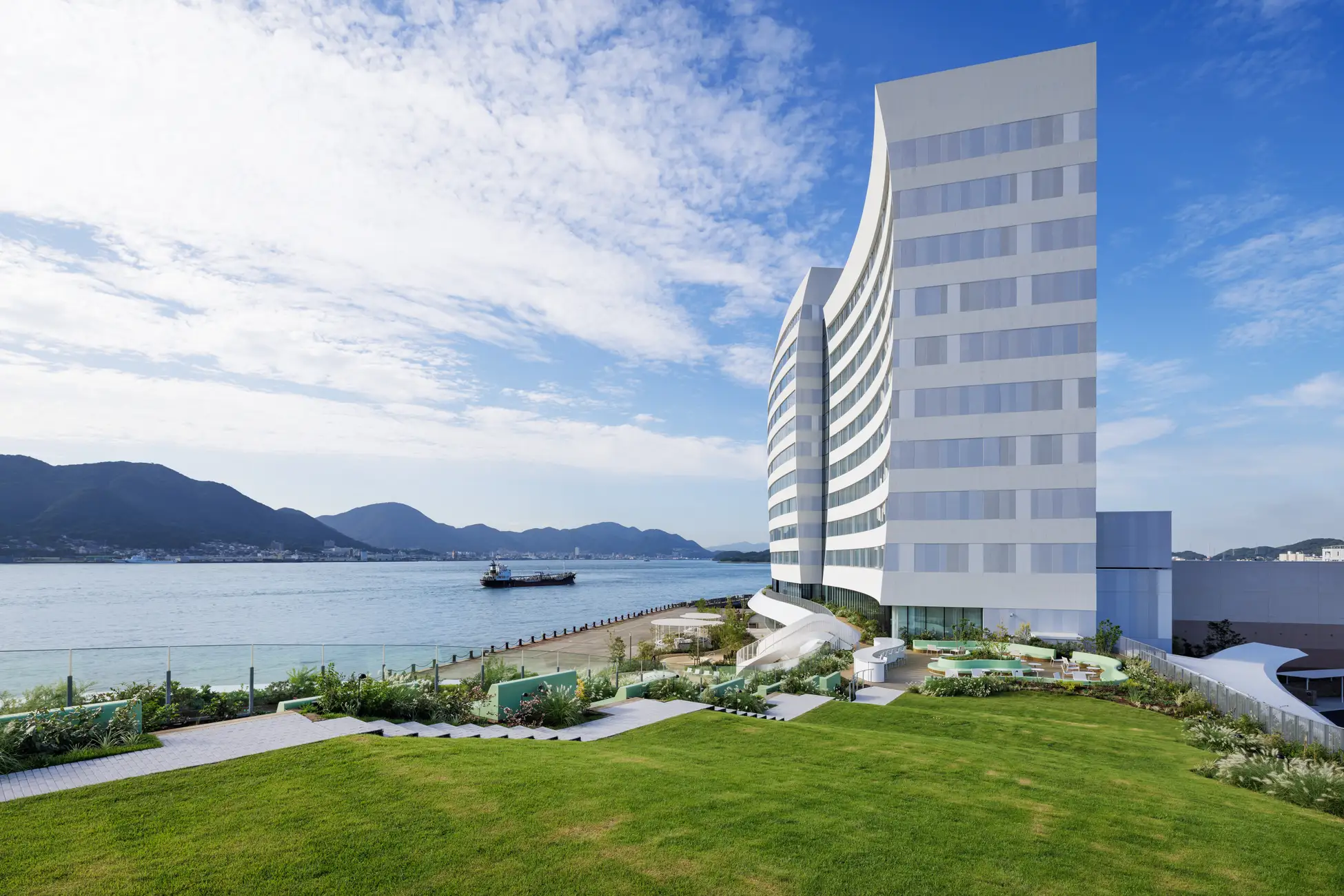 関門海峡を目の前に臨む全室オーシャンビューのリゾートホテル。コンセプトは「海峡のデザイナーズホテル」。客室やプール、テラスからも、時間ごとに移ろう海峡の景色を堪能することができます。また、1日に500隻以上も行き交う「船」や「ふぐ」といったこの土地ならではの要素を取り入れたデザインと食体験、ウォーターフロントの立地を活かしたアクティビティで土地の魅力にひたり、楽しみつくす滞在が叶います。