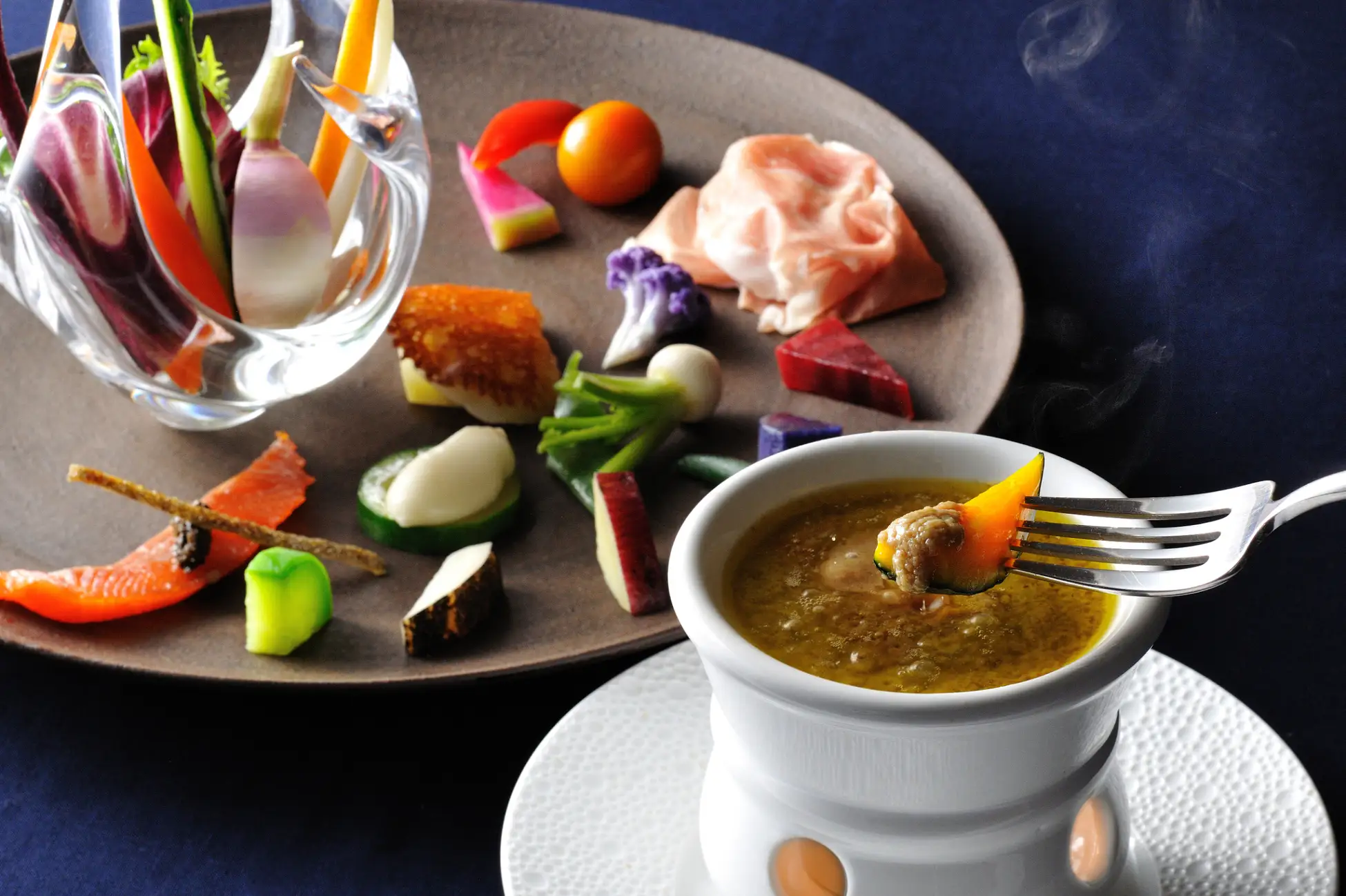 施設内の農園「アグリガーデン」で採れた野菜に加え、那須で生産されるチーズやヤシオマスを盛り込み、恵みを一目で感じられます。ガラスの器に盛ったスティック野菜は手でつまみ、収穫しているような感覚で那須の旬の恵みを楽しめる一皿です。