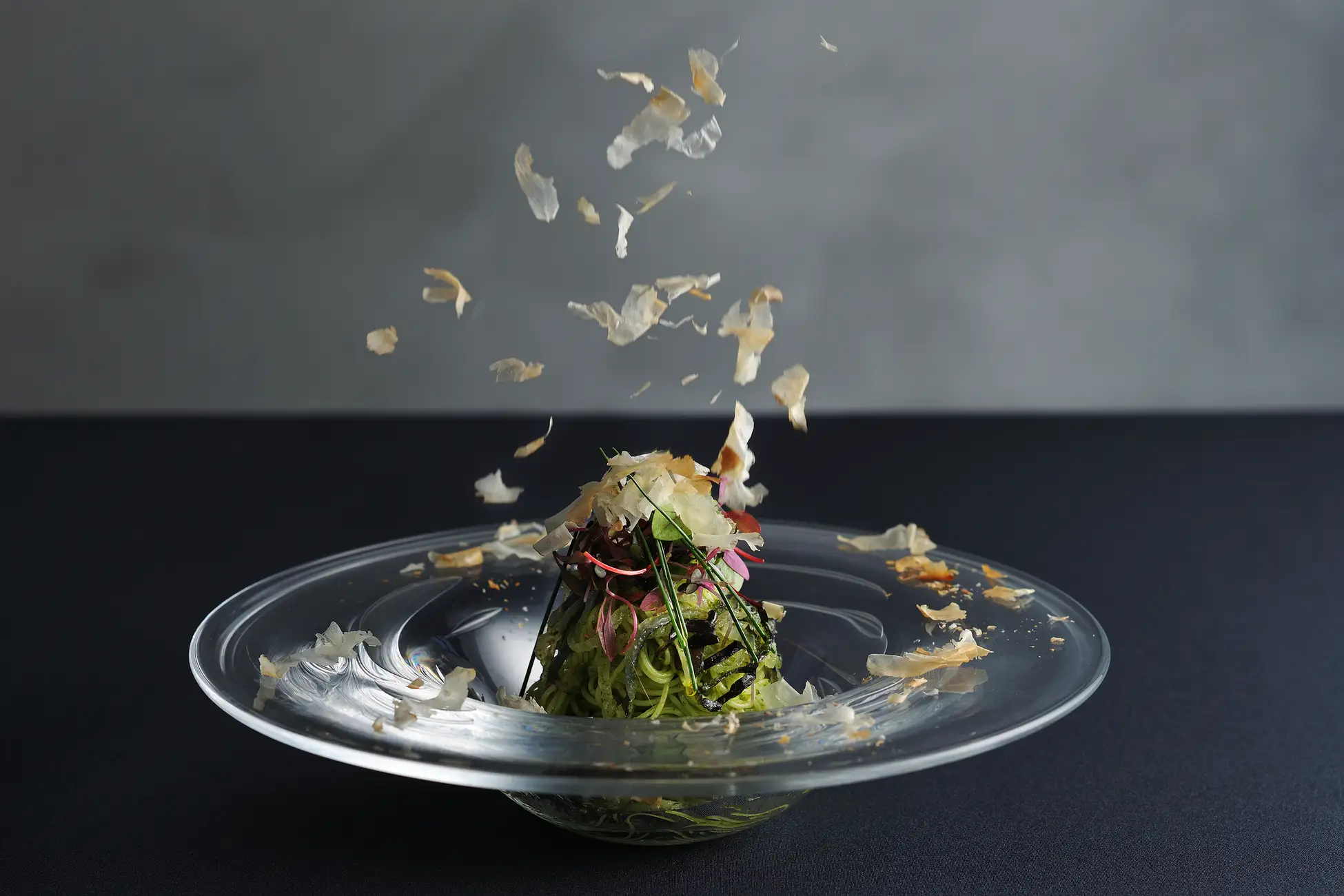 食感が豊かなふぐの皮とふぐと相性の良い、ふくネギ(*1)をピューレに仕立てたソースに絡めた冷製パスタです。仕上げにふぐ節をかけ、香ばしさと旨みを引き立てます。