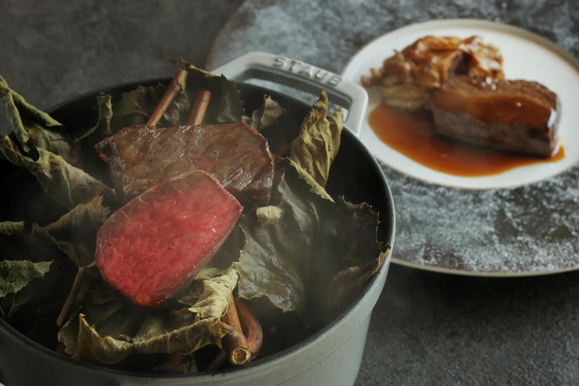 葡萄の搾り粕を食べて育った牛肉に、葡萄の枝や葉の薫香を纏わせて焼き上げ、旨味を一層引き立てた炭焼き料理のグリッリアです。芳醇なポルチーニのグラティナート(*5)を添え、八ヶ岳の自然がもたらす豊かな風味を感じられる一皿です。