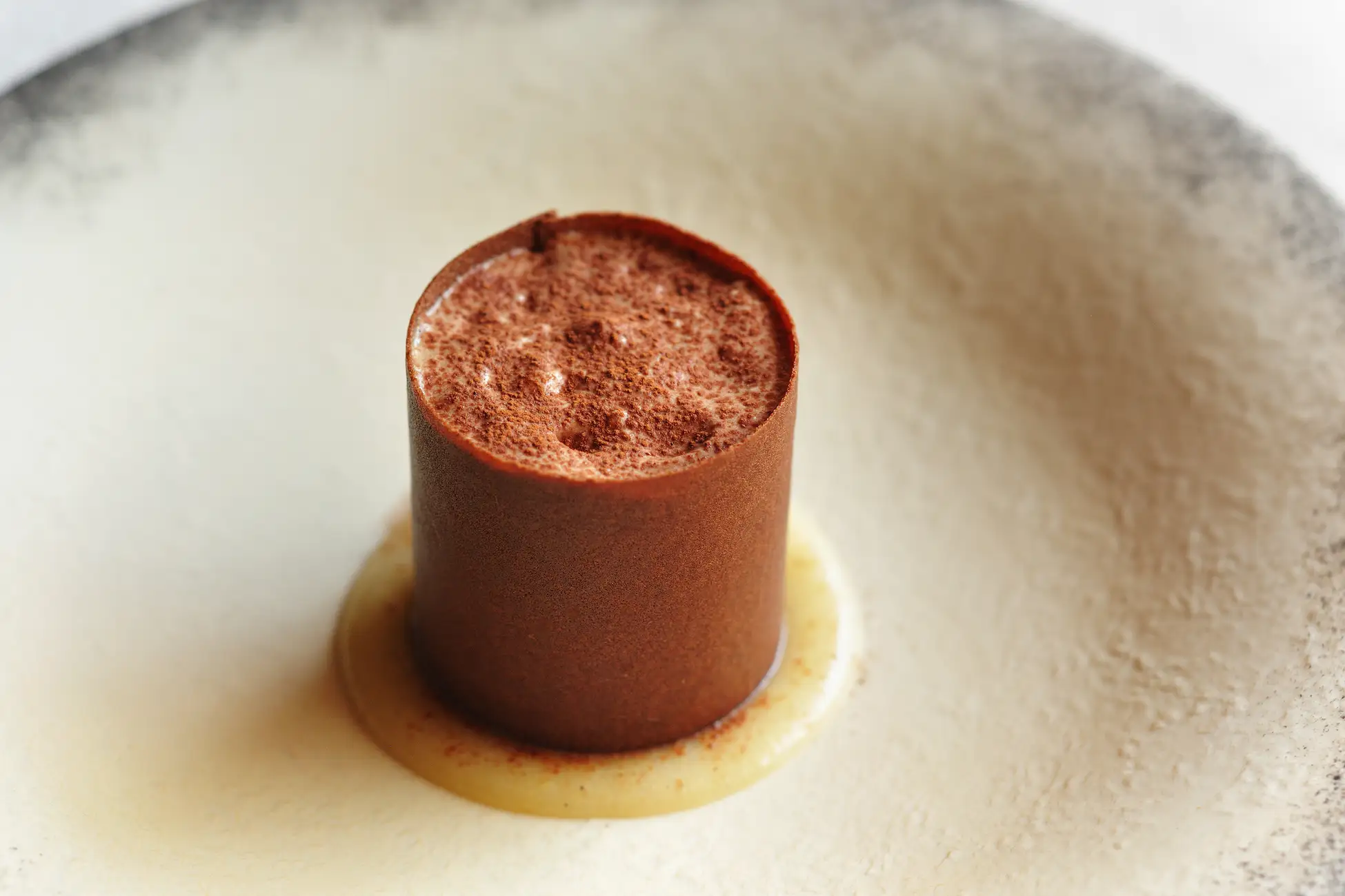 牛蒡の風味を生かしたアイスクリームとエスプーマに、スパイスが香る洋梨のコンポートを添え、食感の良いカカオクランブルをカカオのチュイルで包みました。アイスクリームには牛蒡の実を、エスプーマには焼いた牛蒡の皮の風味を落とし込み、旬の牛蒡を存分に味わえる冬ならではの一皿です。