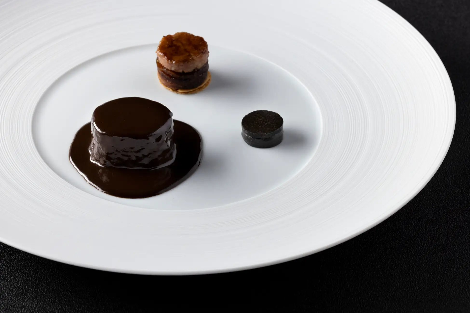 メインのジビエ・ア・ラ・ロワイヤルは、穴熊、鹿、雉、雷鳥など多種のジビエの旨味を凝縮した贅沢な料理です。ジビエの特性に合わせて、苦みに甘みを合わせたり、玉ねぎなどと煮込んだりと調理を施した後、ファルス(混ぜ合わせた具材)にしています。さらにジビエの出汁(フォン)や数種の酒などで5~7日間じっくりと煮込み、野性味を格調高くまろやかなに仕立てました。約一週間かけて作るダークチョコレートを用いた深淵なソースが、この一皿に複雑な奥行きを与えます。