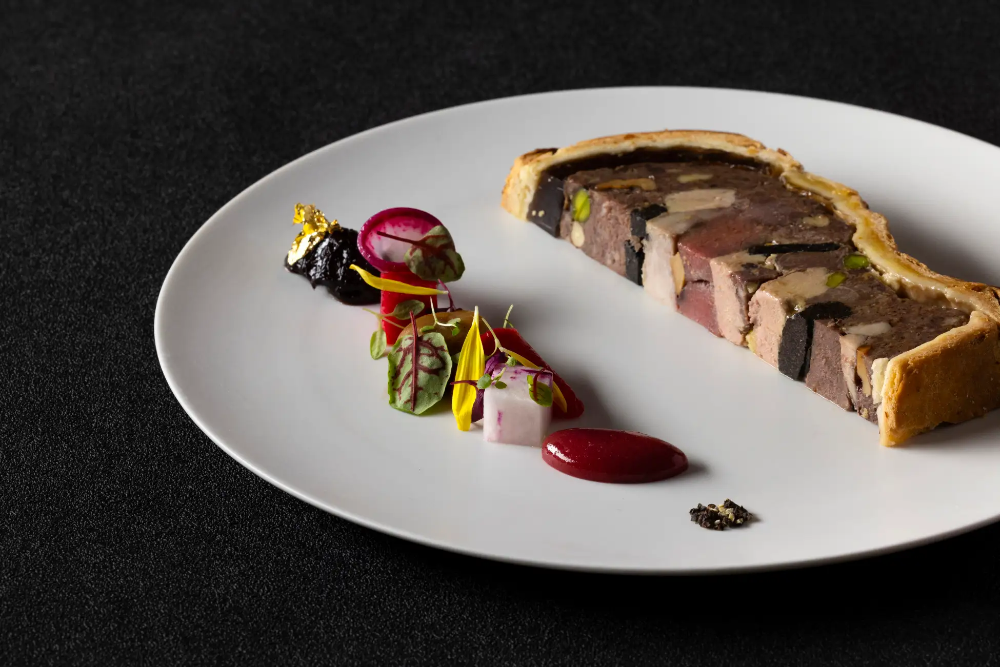 鹿や猪、山鳩など4種以上のジビエにトリュフやフォアグラを幾層にも重ね、パイで包み焼き上げた前菜パテ・ド・ロワ。ジビエの種類や部位ごとにミンチやモルソー(塊)など調理法を変え、食感と旨味のグラデーションを作り出します。王冠を象った特製の金型で焼き上げたパイは、ゲストの前で切り分けられます。幾何学的に重なり合う断面はまさに芸術的です。酸味のあるグロゼイユのソースや甘みを感じる紅芯大根などを添え、ジビエの味わいや食感に変化と新鮮さを加えます。