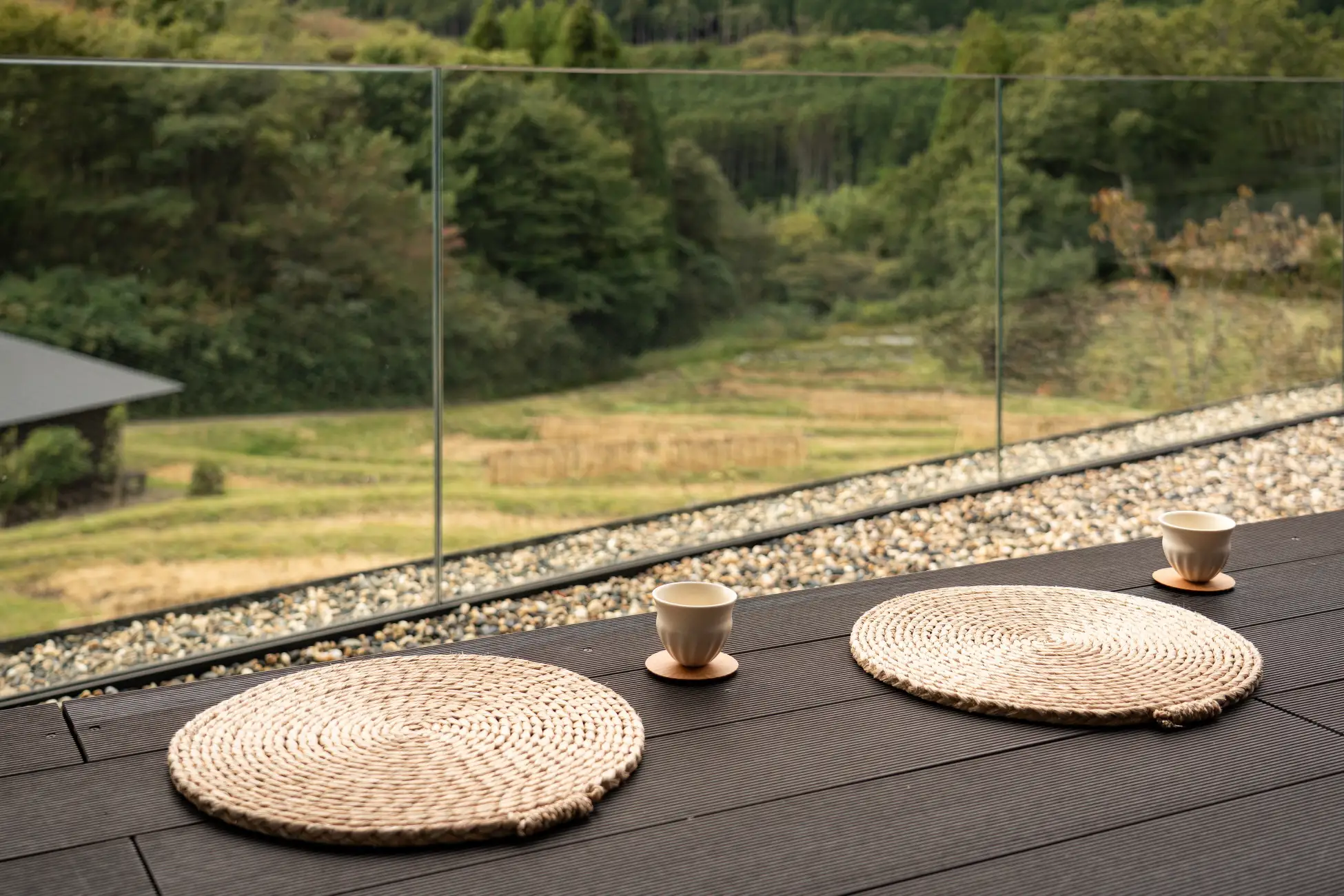 工房での体験後は自身でつくったオリジナルバックを持って界 由布院へ宿泊します。宿の中心に広がる棚田や大浴場から望む由布岳など、由布院の美しい原風景を館内いたるところで感じられます。客室の照明や食事処、パブリックスペースなど至る所に、七島藺が使われており、そのぬくもりを身近に感じることができます。本プラン限定で七島藺で編まれた丸ござも用意します。滞在中は、バックを持って館内を散策したり、棚田を一望できる棚田テラスに丸ござを敷き、のんびりとした時の流れのなかで、七島藺の清々しい香りに包まれながら、思い思いの贅沢な時間を過ごすことが出来ます。