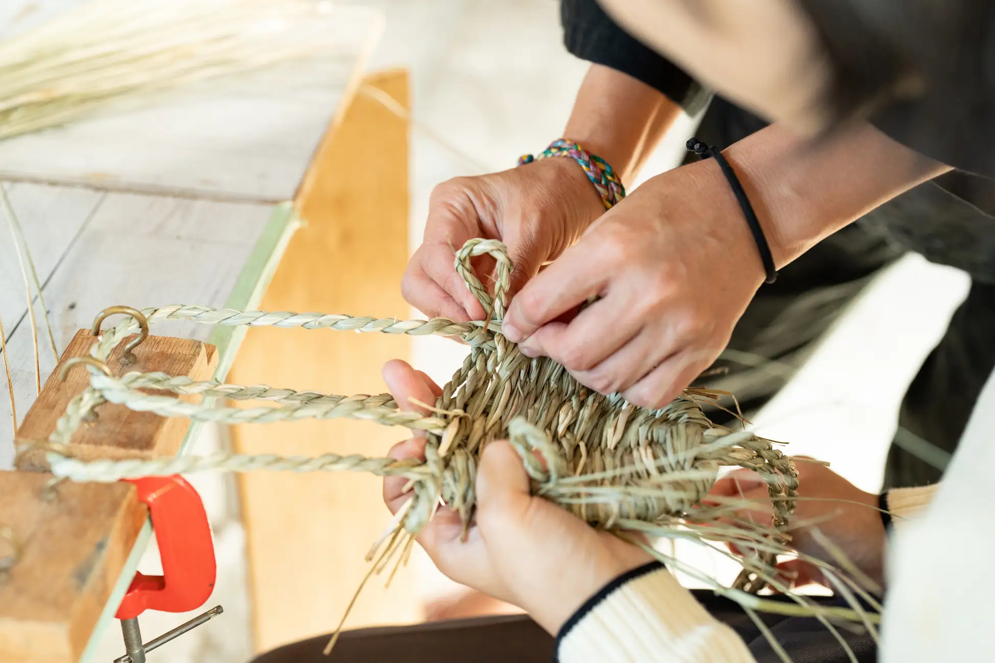 岩切氏より継承にかける想いを伺った後には、実際に七島藺に触れ、オリジナルのバックを製作します。バックを編む工程では、新調したばかりの畳を思わせる、七島藺ならではの清々しい香りに包まれます。岩切氏により特別にレクチャーを受けながら、職人の手仕事に触れることができます。