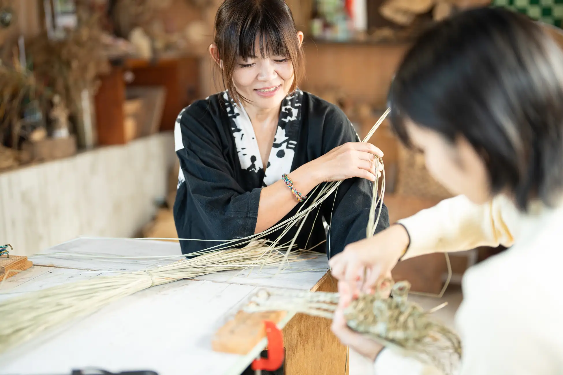 工房では、まず職人から七島藺の辿ってきた歴史を深く学びます。その後これまで畳表や円座、ラグのみだった七島藺の作品をアクセサリーやキッチン用品など幅広い分野に広げて制作を行う岩切氏の作品を見学します。職人自身の言葉で七島藺継承への想いを聞くことができるプライベートな文化体験です。