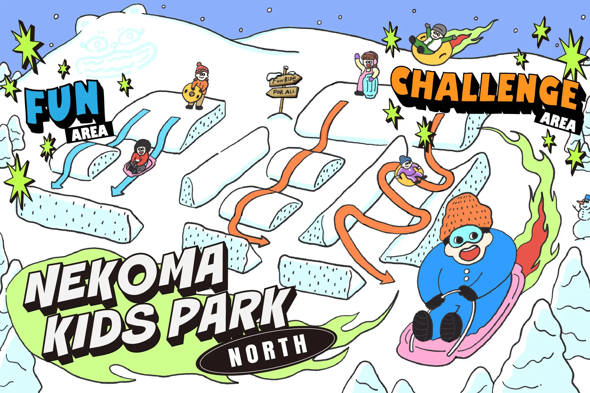 昨シーズン誕生した北エリアのキッズパーク内に、無料の「スノーエスカレーター」が新登場します。登坂時の負担が大幅に軽減され、お子様や初心者の方は疲れを気にせず、何度も滑って楽しめます。ソリやストライダー、北エリア限定のチュービングなどのレンタルも充実しており、手ぶらで気軽に雪遊びが可能です。また、北エリアのリゾートセンター内には、ファミリー専用休憩スペースも設置。屋内でも屋外でも、安心してお子様とお過ごしいただけます。