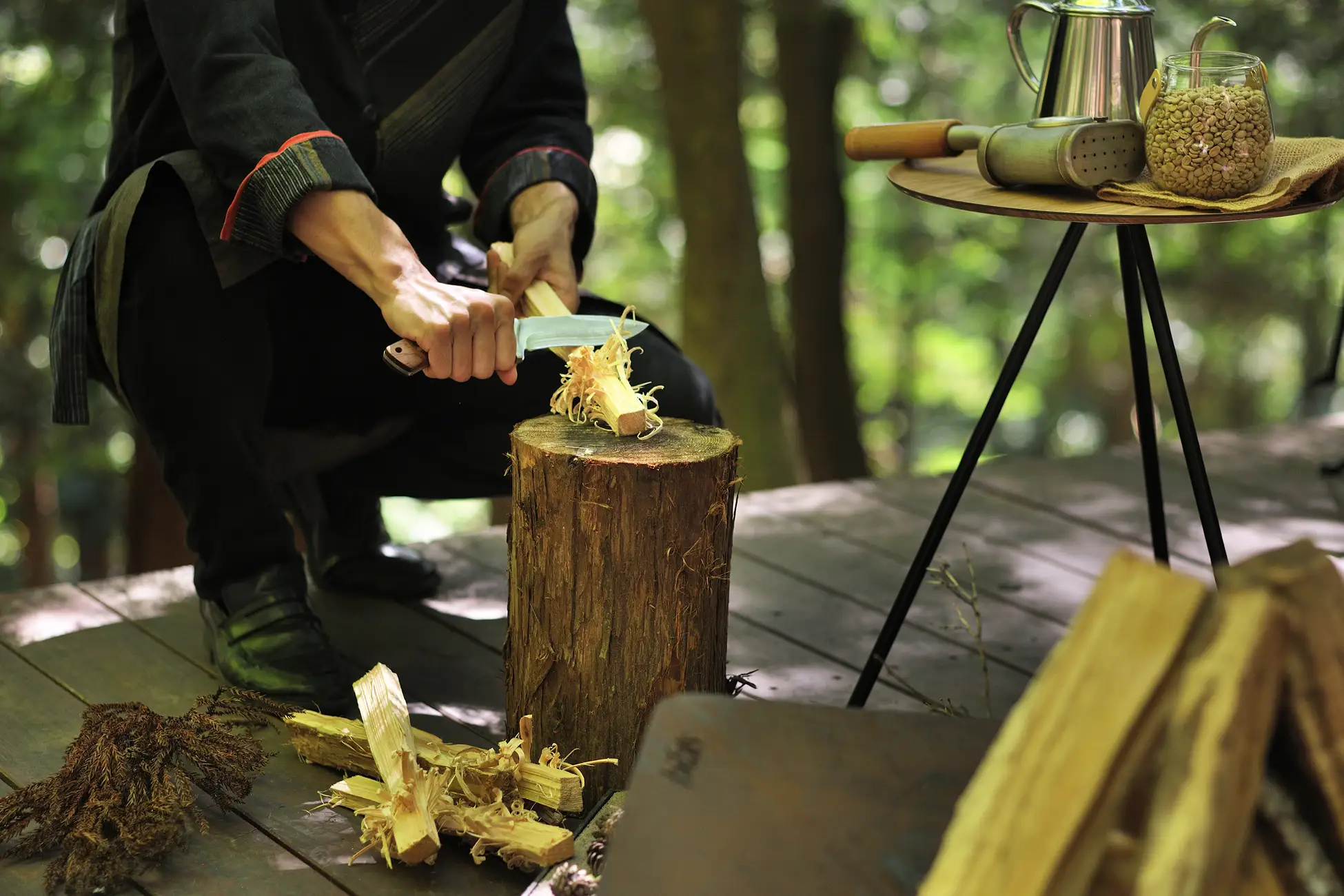 15:15 グランピングマスターとともに「焚き火熾し」をする