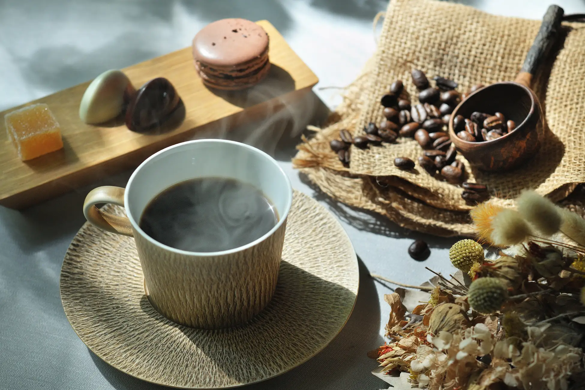 使用するコーヒーは、星のや富士が位置する富士北麓の気候や景色、季節の食材に合わせて考案したオリジナルブレンドです。例えば春は、桜や桃の景色を楽しみながら、山菜や筍、苺などの食材に合うよう、フルーティーで華やかな香りを楽しめる、浅煎りのブレンドを用意します。季節の移ろいとともに変化する景色や料理に合わせた特別な一杯を、味わうことができます。