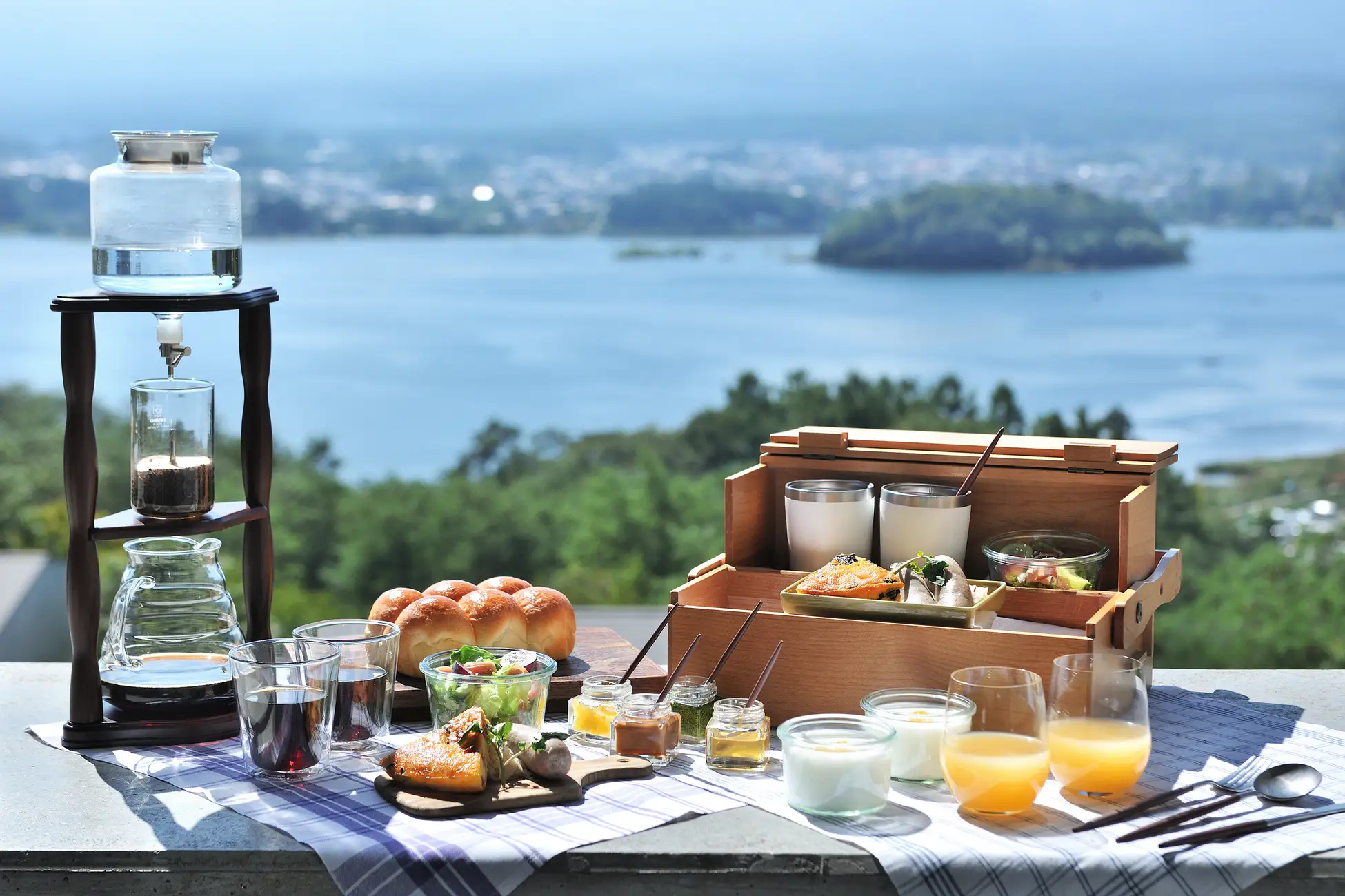 2日目の朝食と一緒に味わうコーヒーは、コールドブリューコーヒーです。一滴ずつ水をコーヒー豆に落とし、前日から時間をかけてゆっくりと抽出するため、酸味が少なくまろやかなコクが特徴のすっきりとした味わいに仕上がります。テラスから河口湖の絶景を眺めながら、モーニングBOXとコーヒーを楽しみ、爽やかな朝を迎えます。