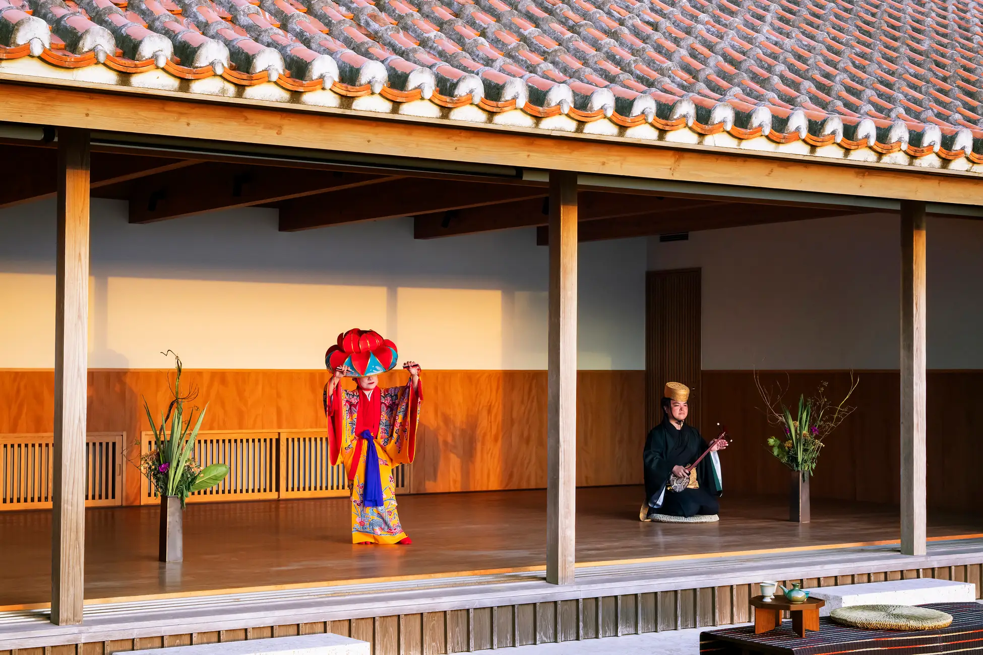 夕陽が差し込む道場で行われる琉球の宮廷芸能