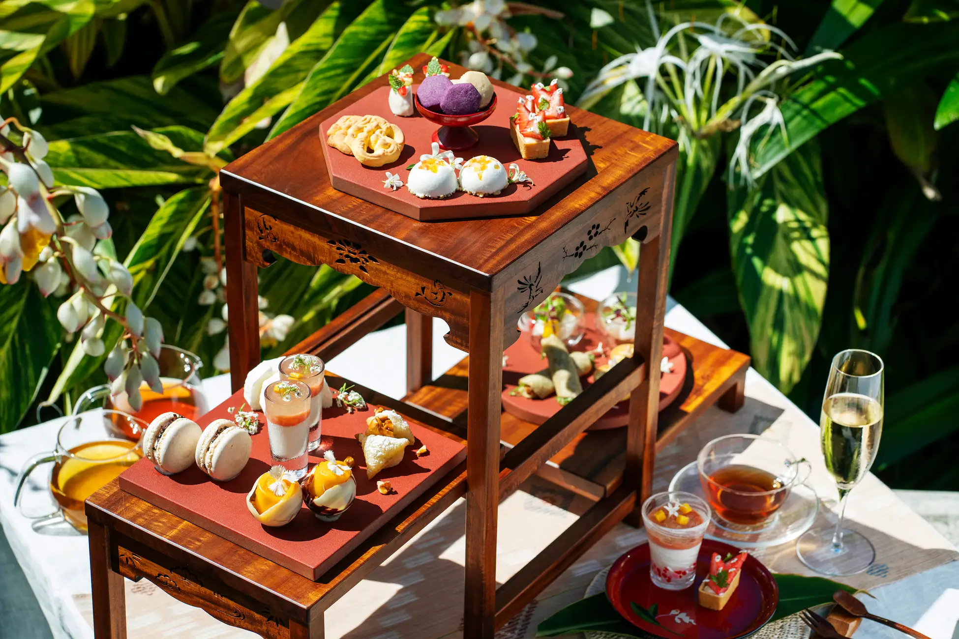 琉球王朝時代から450年間にわたり、客人をもてなす際に振る舞われていた琉球菓子を、モダンなアフタヌーンティーに仕立てました。蓮の花がモチーフのカラフルな琉球菓子「センジュコウ(千寿糕)」を爽やかな「シークヮーサー」香るイチゴのタルトに、シンプルな甘さが特徴の吉野餅は、「ジャスミン」が香るセミフレッドのスイーツへとアレンジ。セイボリーにもシークヮーサーの風味を加え、春の香りを楽しみます。ティースタンドには、王朝時代よりもてなしに用いられる「牡丹」や「オナガドリ」などの彫りが施されており、琉球から続く技に触れることができます。