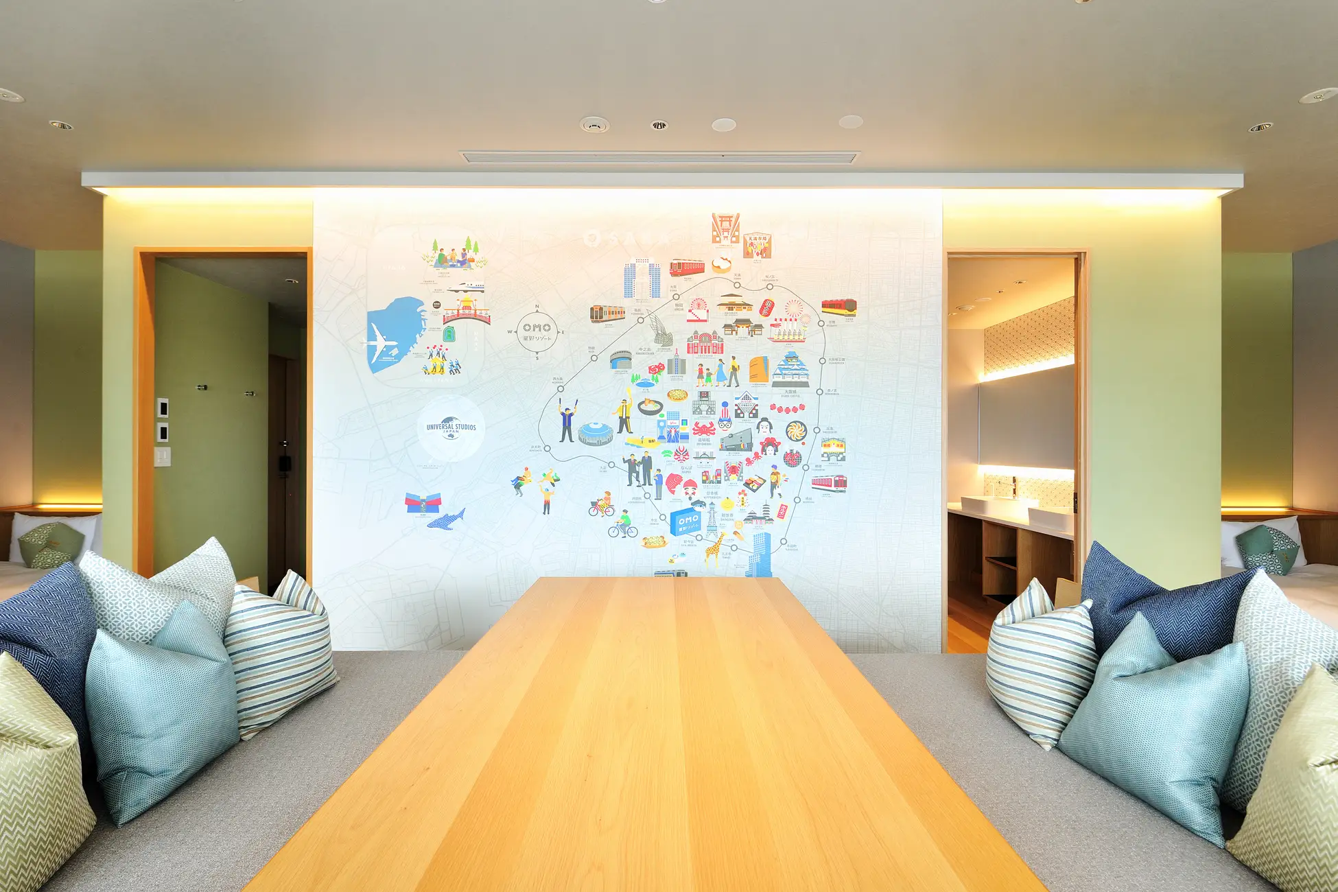 客室は8タイプ全436室。特徴的な客室タイプのひとつが約60平米の「いどばたスイート」です。リビング空間には、大阪の代表的な観光スポットが描かれた「OSAKA ボード」と、大きなテーブル、ソファを配しました。井戸端会議さながらに、旅の作戦会議など自由気ままにおしゃべりできます。最大6名まで宿泊できるので、ファミリーやグループでひとつの部屋に滞在できるのも魅力です。ゆっくり休みたいときには客室の四隅に位置するベッドスペースで。いどばたスイートの他、二面の大きな窓から大阪の街を一望できる「コーナーツインルーム」をはじめ、旅のニーズにあわせて選べる多彩な客室を用意しています。