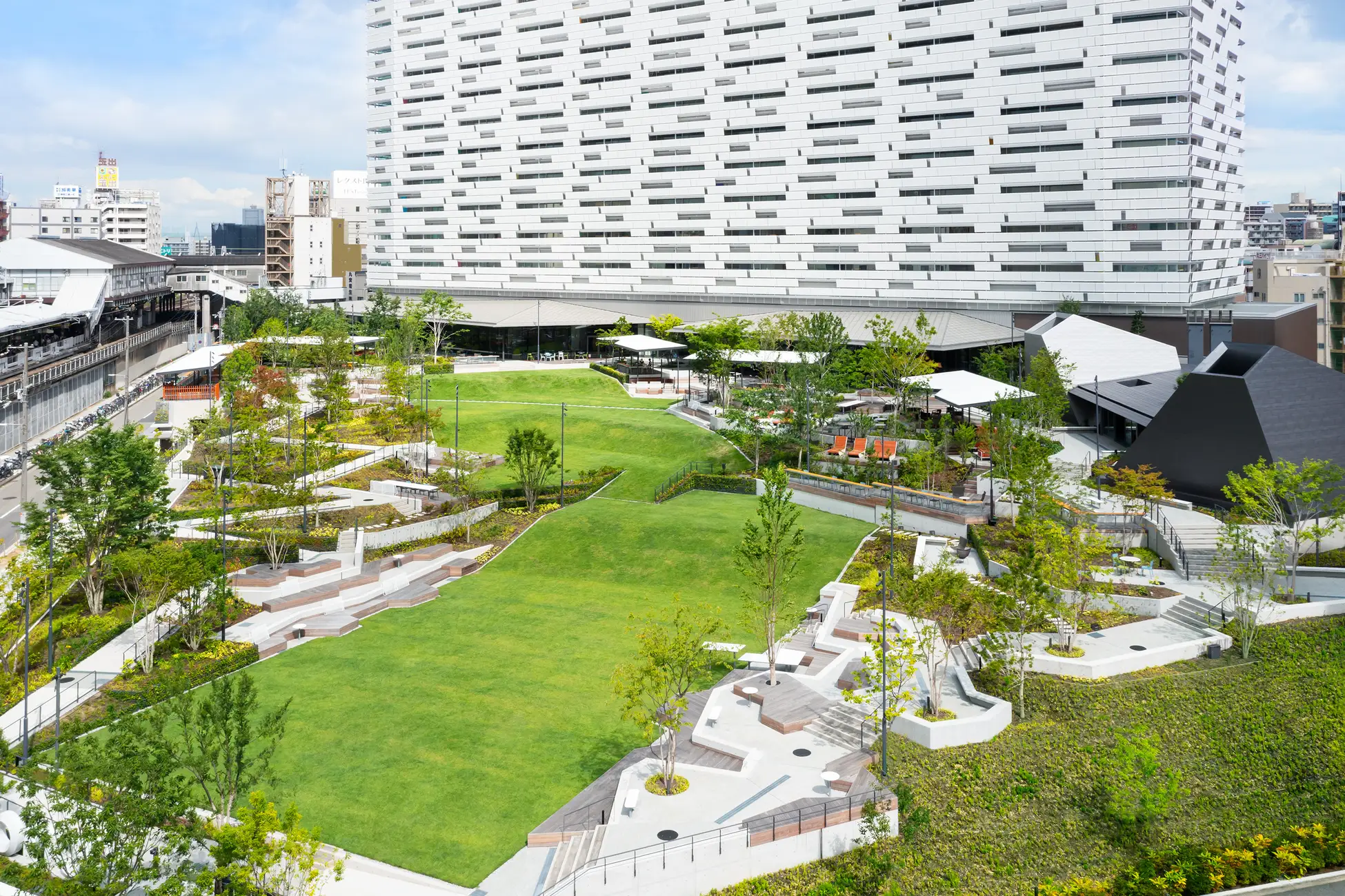 「みやぐりん」は、都市部にありながら緑を感じられるガーデンエリアで、敷地の半分となる約7,600平米の大きな芝生広場です。それを囲う段々のデッキテラスや散策路などで構成された、緑の丘のようなエリアで、芝生や高木による冷却効果と日射遮蔽効果によって、環境負荷を低減する役割を果たしています。ナイトタイムには、大阪の活気やグルメ、エンターテインメントを凝縮した「OSAKA PIKAPIKA NIGHT」を毎晩開催し、開放感あふれる広場で、寝る直前まで大阪の街を楽しみつくす体験を提案しています。
