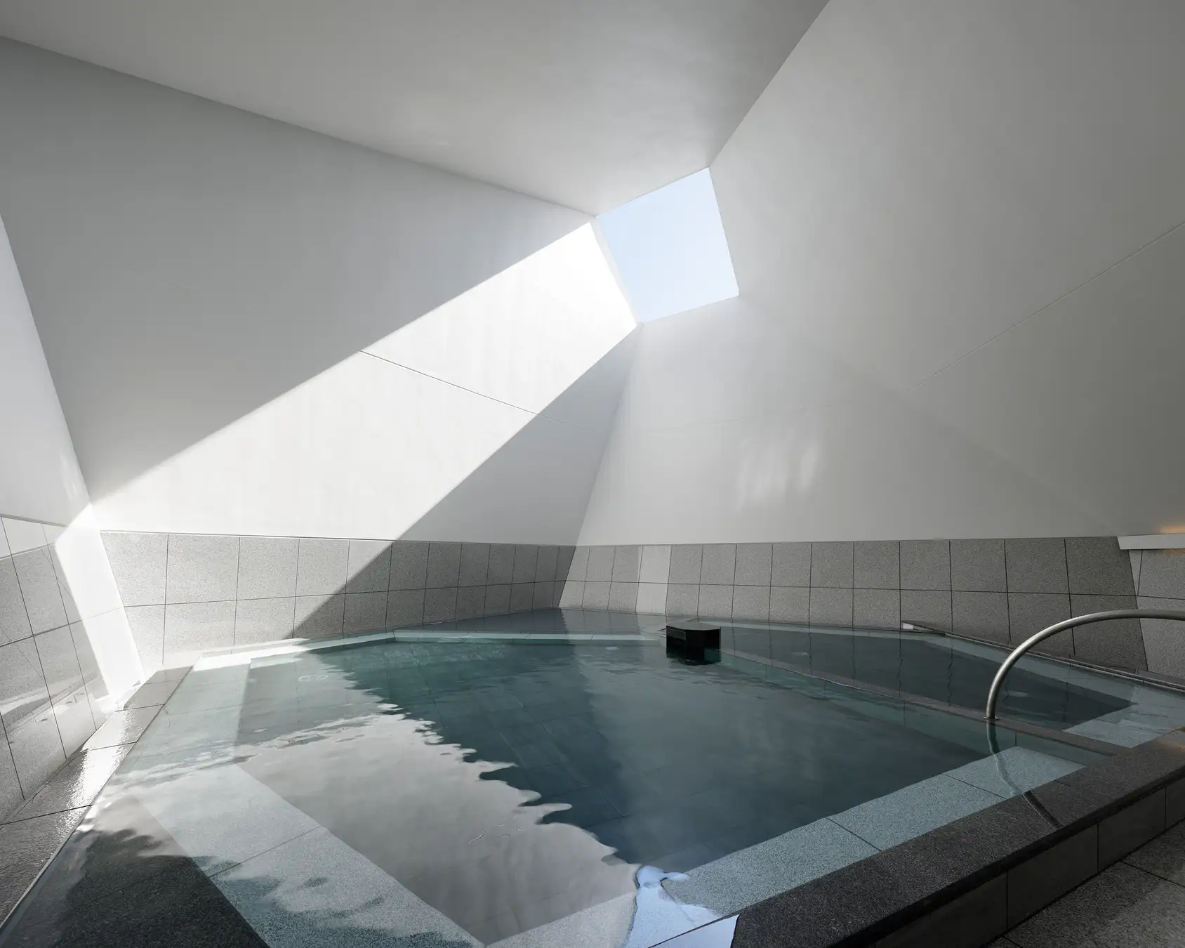 エキサイティングな体験が連続する旅の合間には広いお風呂でリラックスを。みやぐりんに併設されている湯屋は、大阪にお風呂屋文化が花盛りとなった時代を参考に「光と影」を表した外観が特徴です。天井部分には外に通じる天窓があり、浴室にいながらも、外の空気を感じることができます。外から光が差し込む時間帯には、浴室内に光がやさしく反射し、白い異空間のようです。