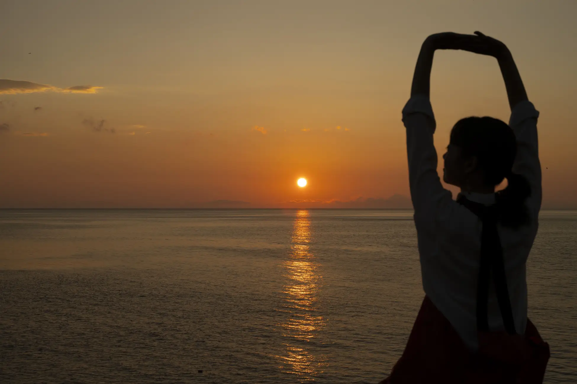 漁へ向かう船上では、絶景の朝焼けを臨むことができます。水平線から昇る朝日が熱海の街並みを赤く染め上げる瞬間は、船の上からしか見られない特別な光景です。漁のポイントに到着するまでの間、スタッフが簡単なストレッチをレクチャー。日の光を浴びながらゆっくりと身体を起こし、網の引き上げに向けて準備を整えます。