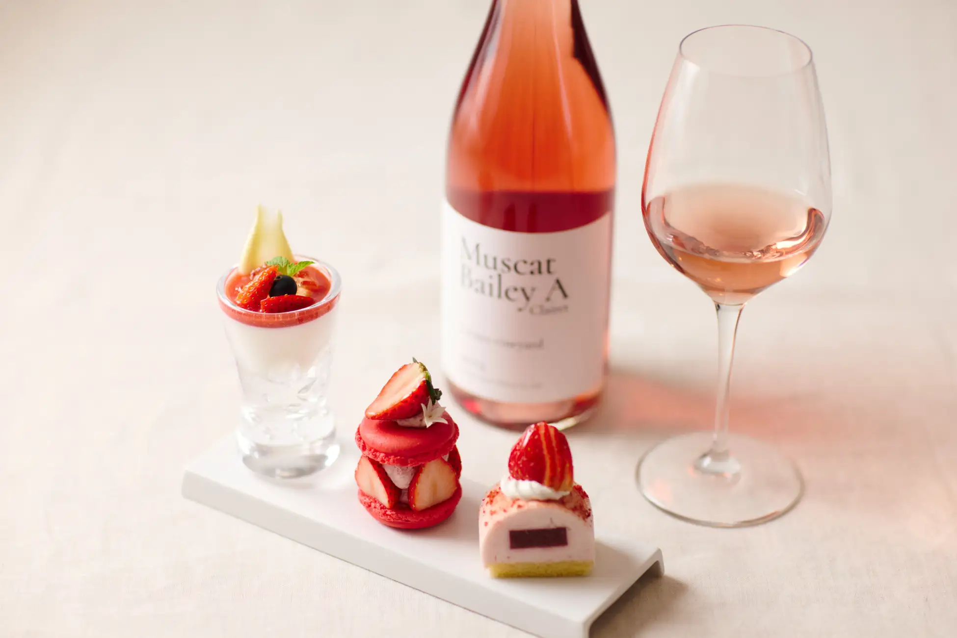 ~今年は山梨県を代表する葡萄の品種「マスカット・ベーリーA」のロゼワインと合わせて堪能する苺のスイーツやドリンクが新登場~