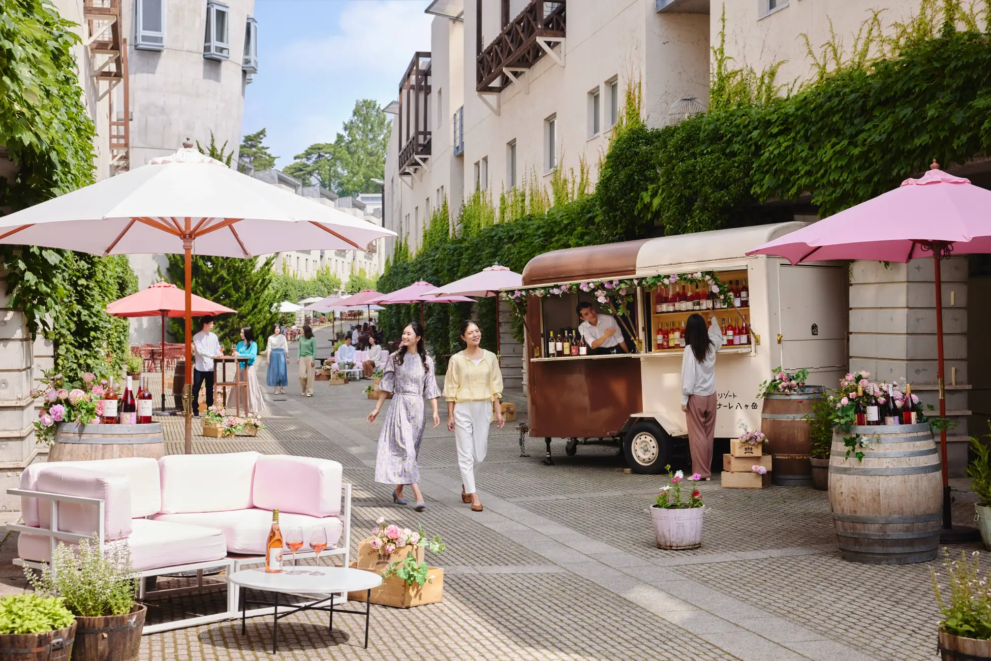 ロゼワインは使用する葡萄の品種や製法によって、色調が異なります。そのロゼワインの豊富な色調をイメージしたパラソルやソファでピーマン通りを彩ります。春を感じる華やかな空間で、思い思いの時間を過ごせるイベントです。