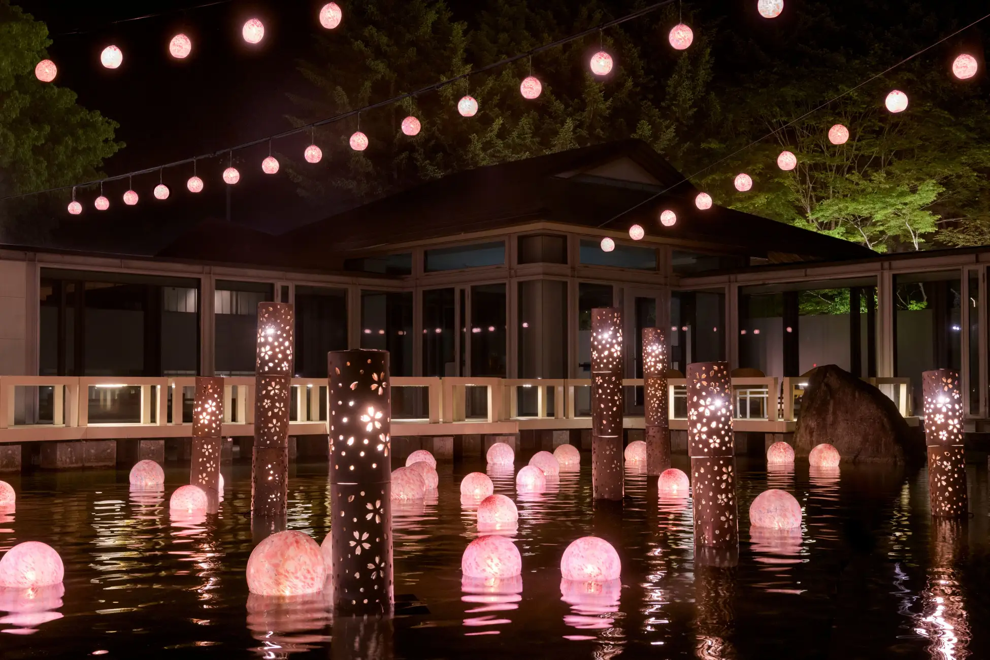 施設の象徴である「津軽四季の水庭」に、津軽地方の伝統工芸品である「津軽びいどろ」と「津軽金山焼」の灯篭をしつらえて、一足早い春の訪れを表現します。満開の桜が夜を明るく照らす情景を表す「花明かり」をテーマとし、灯りを水庭に浮かべて華やかで幻想的な空間を演出します。優しく揺れる光に包まれた水庭で春の訪れを五感で感じながら、心安らぐ夕食後のひとときを過ごすことができます。