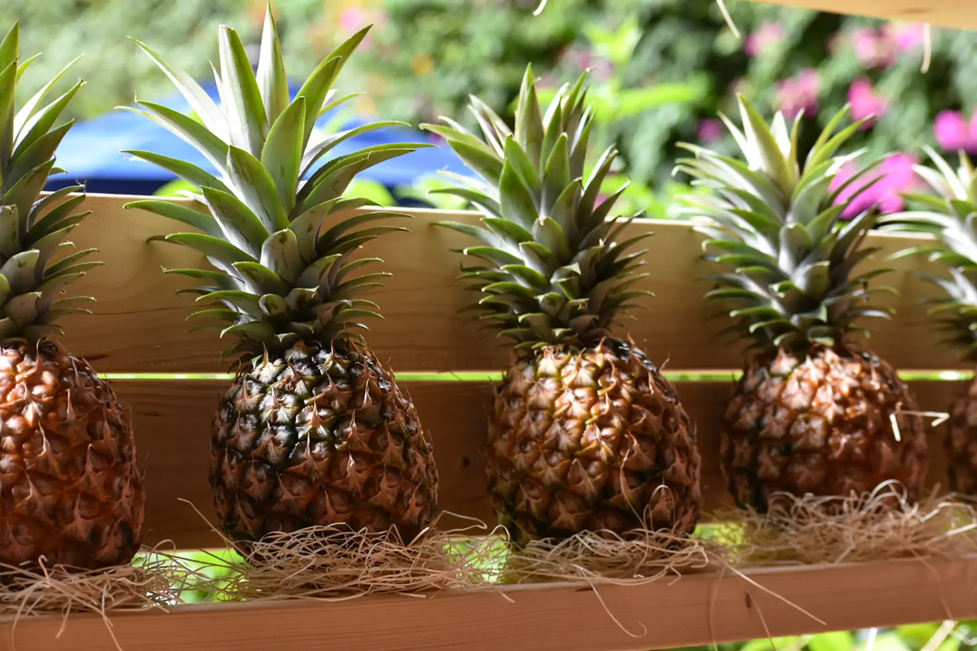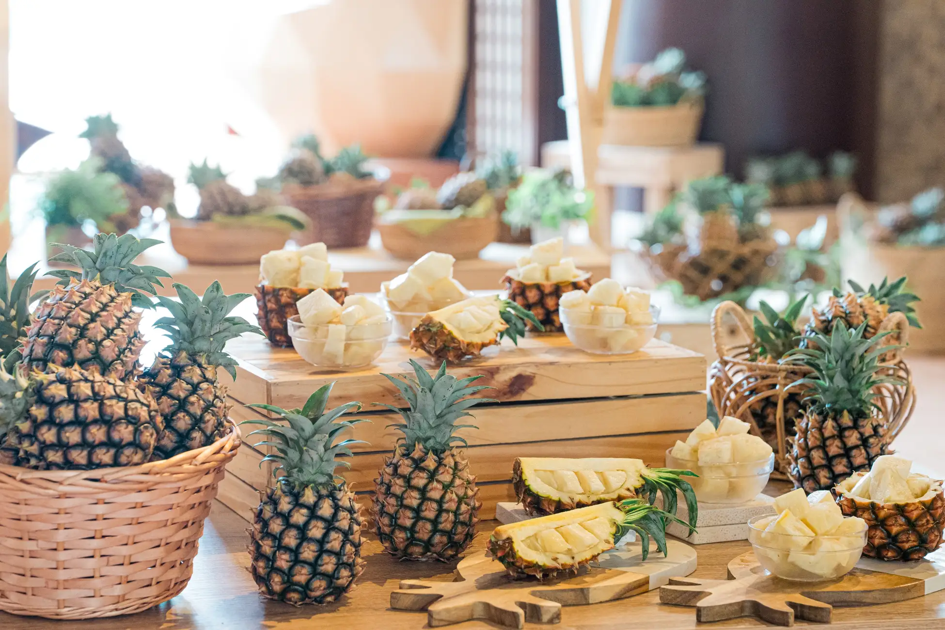 ピーチパインは、小ぶりな果実に果汁がたっぷりで、果肉は白っぽく、香りは桃のようなさわやかさが特徴です。また、パイン特有の繊維感も少なく、芯の部分まで食べられます。収穫後に追熟しないピーチパインを、完熟の一番美味しい状態で食べられるのは生産地だからこそです。本イベントでは、そんなピーチパインをカットし、ロビーにて提供します。イベント期間中、みずみずしい食べごろのピーチパインを毎日楽しめます。