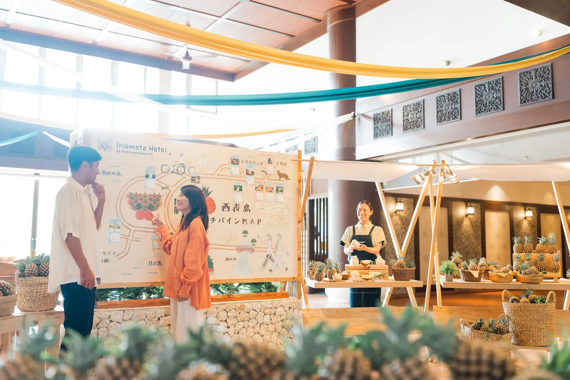 イベント期間中、島内の飲食店では、パフェやスムージーなど、ピーチパインを使用したメニューを提供します。島内散策でもピーチパインをとことん楽しめるよう、地域店舗と協力して収穫シーズンを盛り上げます。さらに、地域でピーチパインを楽しむことができる場所をまとめた「西表島ピーチパインMAP」が今年もホテル館内に登場。パイン畑が見える絶景スポットやピーチパイングルメを堪能できる飲食店など、おすすめスポットが盛りだくさんのMAPです。このMAPをもとに島内を散策することで、よりイベントを楽しむことができます。