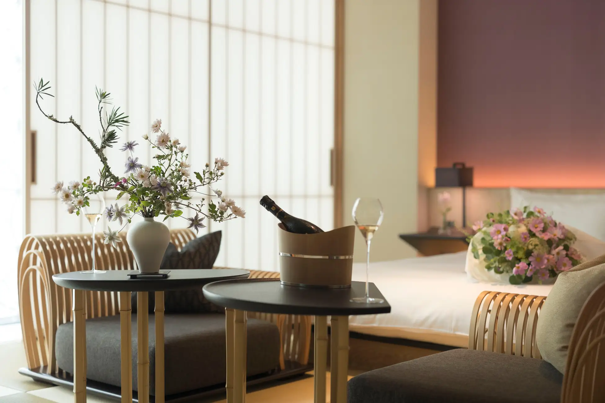 「花の開花」は、春の始まりの情景を表す言葉として日本ではよく使われます。人生の節目や門出を迎えるこの時季に、星のや東京スタッフと専属の華道家と一緒に、滞在中に利用する客室や共有スペースに花を設え、大切な人にさりげなく想いを伝えます。ご出発前には、室礼に使用した花を用いてお花箱を作り、ご自宅に持ち帰ることも可能。大切な人と過ごすかけがえのない時間です。