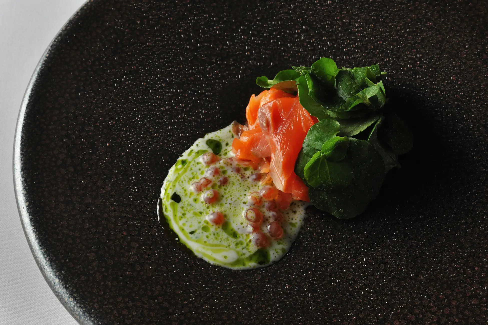 奥入瀬渓流ホテル内のフレンチレストラン「Sonore(ソノール)」は、生産者と向き合い、その想いを料理で表現しています。シェフの簑原より、青森の食材や生産者への想いを聞きながら、冷前菜「サーモン クレソン」を味わいます。青森の風土が育んだ食材と、その背景にある歴史や作り手のこだわりをフランス料理の技法で表現する一皿です。王林さんはこの一皿を通じ、青森の風土が育む食材の魅力とその背景にある食文化、そしてそれを支える人々のストーリーに触れます。