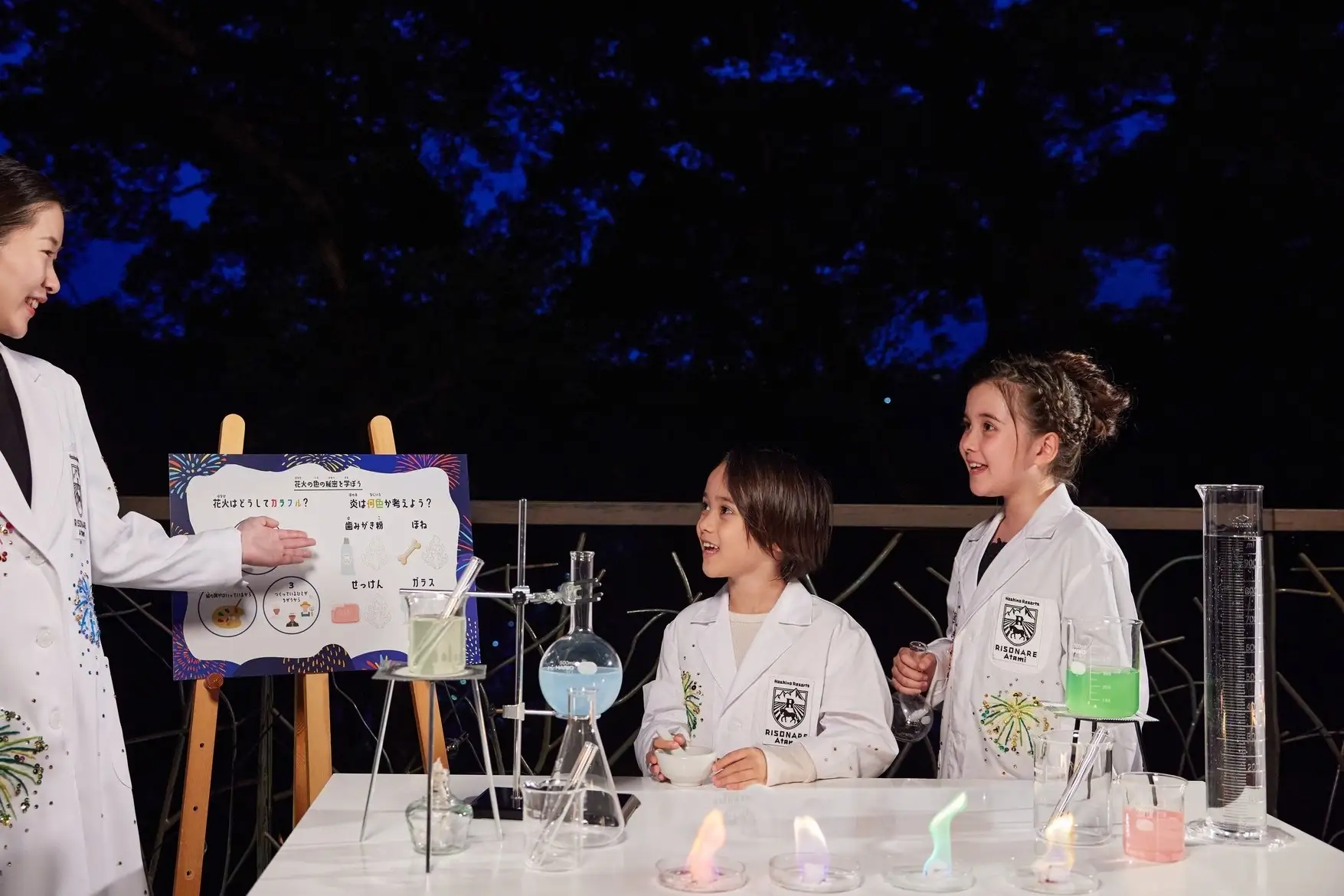 リゾナーレ熱海が位置する静岡県熱海市は、70年以上の歴史を誇り、年間を通して開催される「熱海海上花火大会」が名物です。この地域文化を背景に、リゾナーレ熱海では花火の構造を学ぶ「花火の学校」を開催しています。プログラムでは、手持ち花火の発色原理である「炎色反応」の実験を行い、色の変化を間近で観察。仕組みを理解した上で花火の輝きを鑑賞することは、子どもたちの新たな発見や自発的な問いを生み出すきっかけとなります。