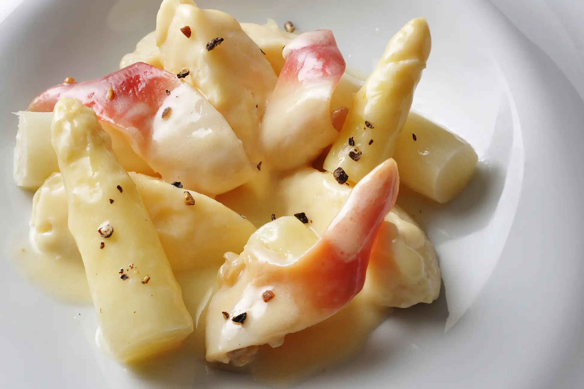 旬のホワイトアスパラガスと、濃厚な旨味を蓄えた北寄貝をたのしむパスタ料理です。アスパラガスとファーム星野(*2)のリコッタで仕立てた「ニューディー」(*3)に、あさりの出汁を効かせたバターソースが贅沢に絡み合います。ホワイトアスパラガスのシャキッとした歯ごたえと、北寄貝の弾力ある食感、そしてニューディーのとろけるような口当たりのコントラストが楽しい一皿です。