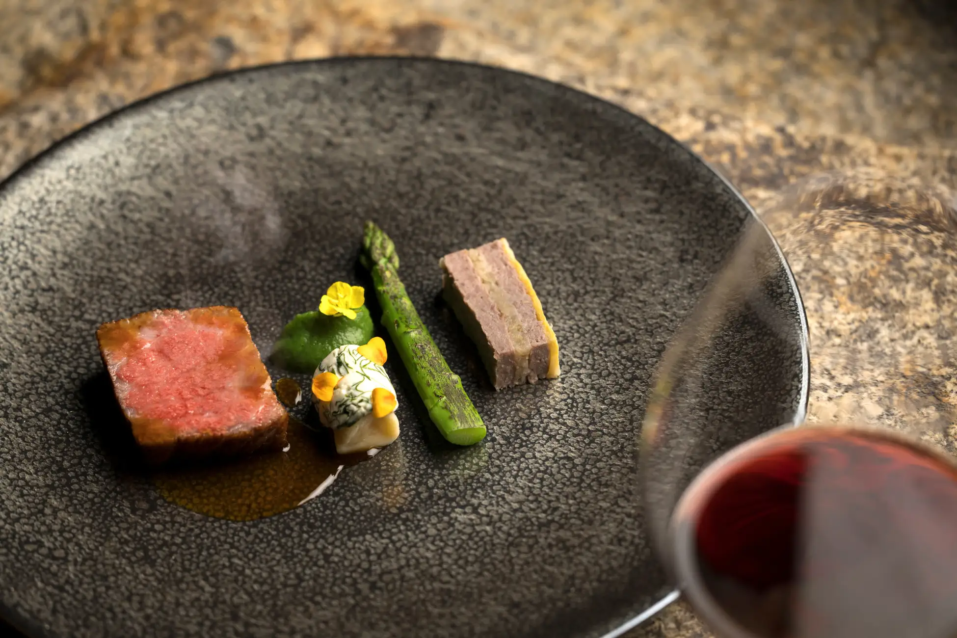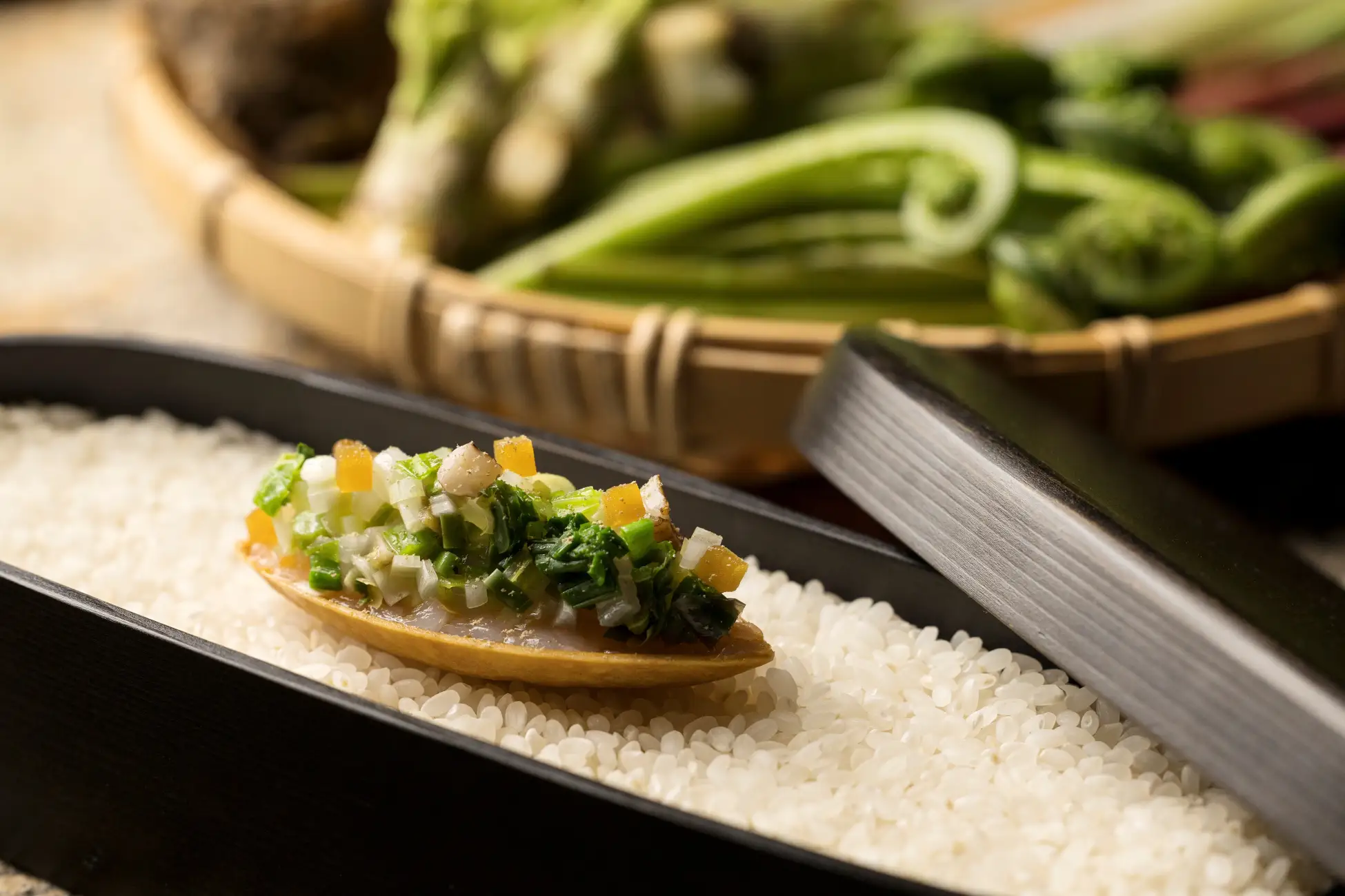 メインの肉料理には、アスパラガスとともに、滋賀の郷土料理にちなんだ付け合わせを添えています。団子を白和えで包んだ「おあえ団子」は、もちもちとしたニョッキに豆腐とクレソンの合わせバターをのせて食感と味わいを再現しました。「鮒ずし」の飯(*3)に漬け込んだ牛ミンチで仕立てる付け合わせは、鮒ずしならではの酸味と旨味を感じ、伝統の食文化と独創的な発想が融合した一皿です。