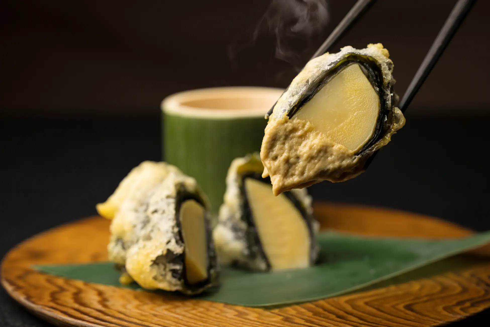 鶏肉や野菜を青竹に入れて火にくべ、竹の香りとともに楽しむ宮崎の郷土料理「かっぽ鶏」を、春の食材でアレンジしました。出汁で炊いた筍にワカメを巻き、軽やかな食感のベニエ(*1)に仕上げました。鶏出汁やレバーペーストの旨みを凝縮し、ヴァンジョーヌ(*2)を香らせた芳醇なソースに絡め、味わいの変化も楽しめます。春の出合いの「若竹」に、和洋が融合する奥行きを重ねた一皿です。