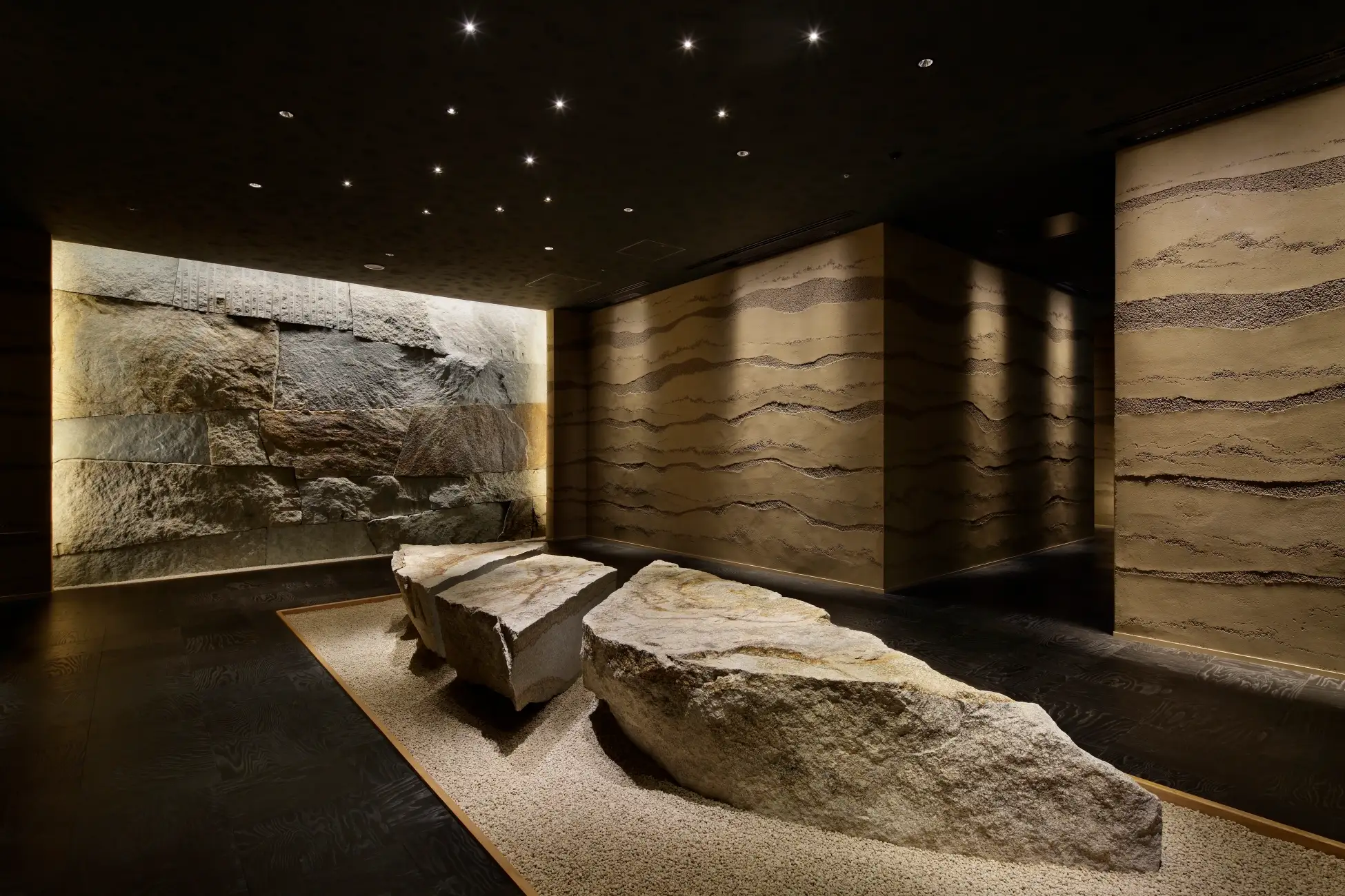 日本の伝統様式を重んじながら、現代に合わせて進化し続ける日本旅館「星のや東京」。その地下1階にあるダイニングでは、地層をイメージした左官仕上げの壁と大きな御影石が迎え入れます。エントランスを抜けると、6室の畳敷きの個室、4つのテーブル席があります。和の静けさが漂う落ち着いた日本旅館の空間で、滞在着のまま肩肘張らずに食事が楽しめます。