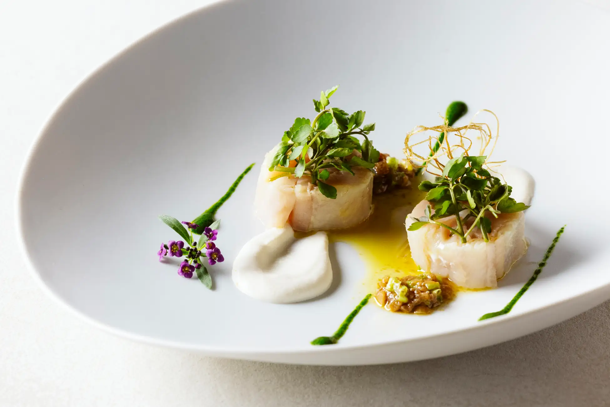 ヤマゼリの美味しさを、葉・茎・根のすべてを用いて余すことなく表現しました。葉はサラダ仕立てで香りを、茎は温かいドレッシングで食感を、そして根はフリットにして甘みとコクを引き出しています。合わせるのは、低温でじっくり火を入れたヒメマスのミ・キュイ(半生)。ヒメマスのとろけるような上品な旨みが、ヤマゼリの青々とした清涼感と口の中で鮮やかに共鳴するひと皿です。