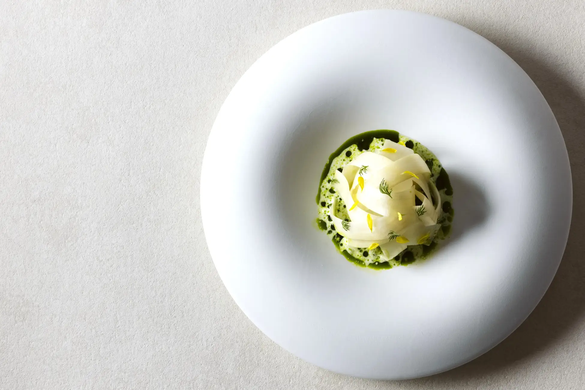 ほのかな苦みが魅力の山菜ウドを、信州の伝統的な食材の鯉に合わせた一皿です。ウドはスライスし、素材そのものの瑞々しさを生かすものと、マリネして酸味を持たせたもの、その2つをドーム状に重ね合わせました。その下には、コリコリとした食感を楽しめる鯉と、軽くスモークして香りを纏わせた鯉が隠れています。鯉のコンソメとハーブが調和するソースが全体にコクと清涼感を与え、洗練された味わいを生み出しています。
