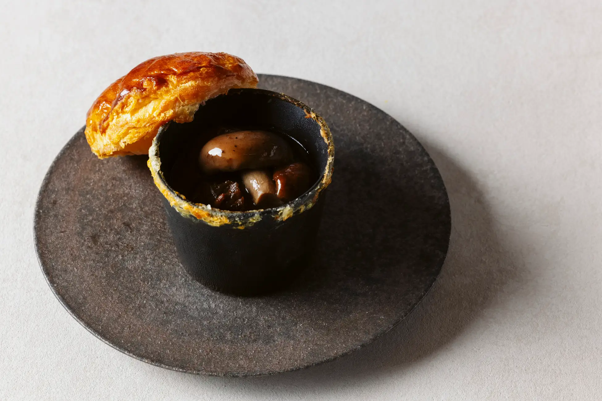 秋の印象が強い茸ですが、バラ科の樹下にのみ芽吹く希少な「梅春シメジ(うめはるしめじ)」(*1)など、春にしか出会えない滋味があります。「春キノコのパイ包み」では、この梅春シメジやヒラタケなど4種の茸と、牛頬肉の煮込みを合わせました。サクッとしたパイを崩した瞬間、芳醇な香りが立ち上り、茸の濃厚な旨味が溢れ出します。茸で春を味わう逸品です。