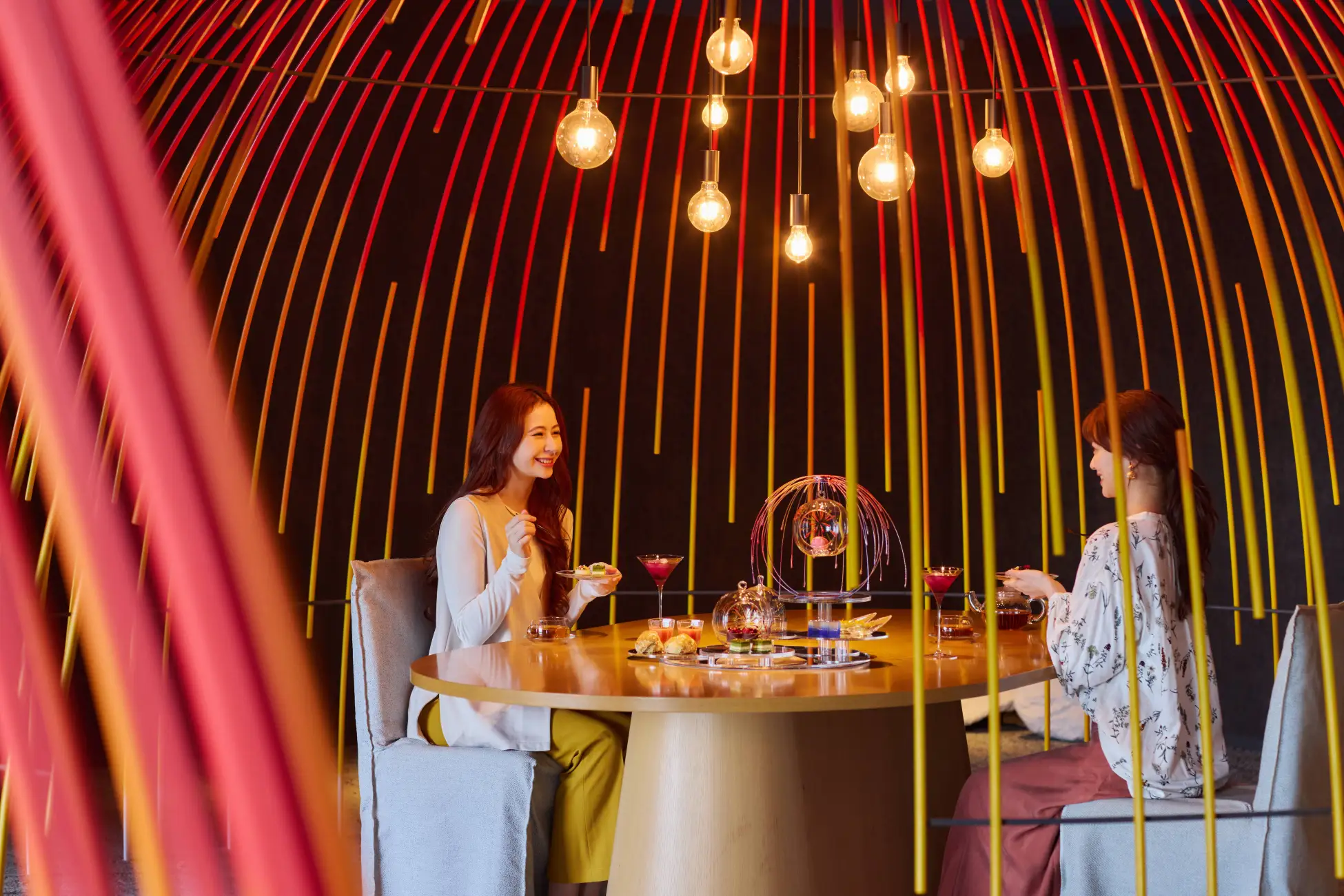 アフタヌーンティーを満喫するのは、まるで夜空の花火に包まれているかのような空間デザインが特徴の「和食ダイニング 花火」です。空間全体に広がる花火のアートが、熱海の海上花火大会を思わせる華やかな情景を映し出します。ゆったりと語らいながら、特別なアフタヌーンティータイムを過ごすことができます。
