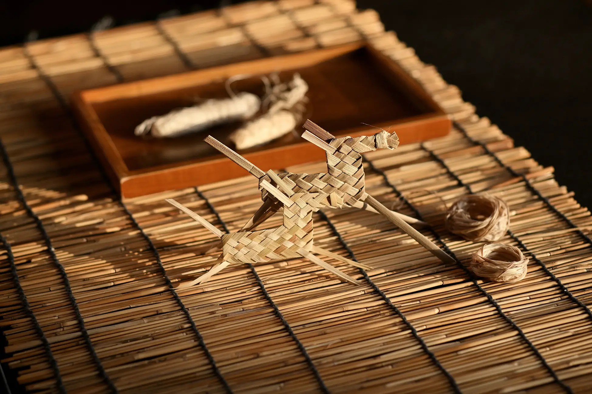 竹富島では強い夏の日差しを避けるため、早朝や夕方に畑仕事を行ったり、日中は家の中で畑仕事の準備や民具づくりをしたり、工夫しながら生活していました。その暮らし方に倣い、島の遊びを木陰や客室で楽しめるよう、キットを用意。島に伝わる昔ながらの民具づくりを継承する「クージの会」の協力で、竹富島に生えるアダンやマーニの葉を乾燥させた材料を使った島らしい作品を作り、遊ぶことができます。