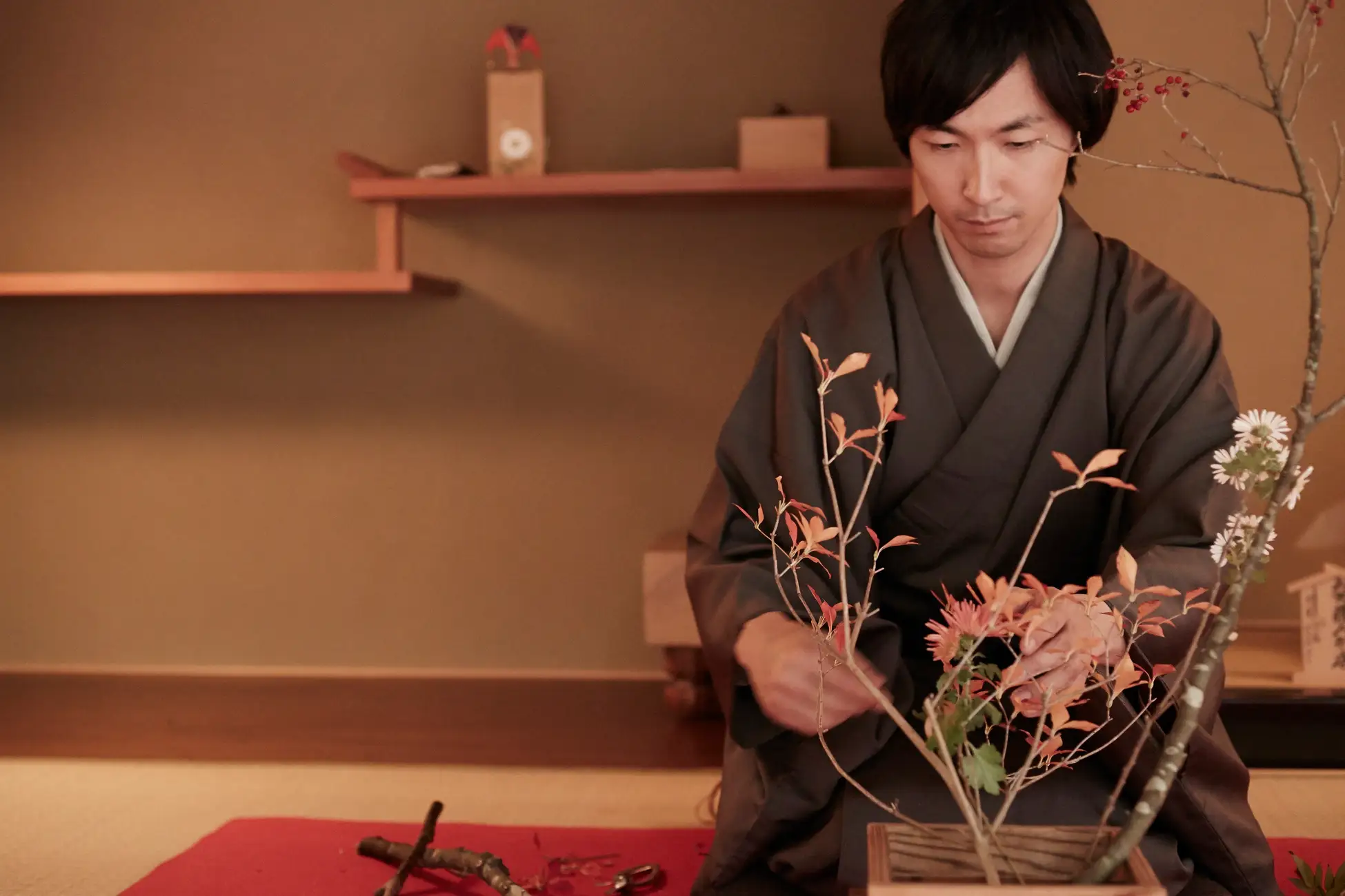 未生流笹岡家元から直接華道を学ぶことができるプライベートレッスンです。静謐な和室で花材と対話し、生け方の初歩から日々の暮らしに通じる教えまで得ることができます。草花の取捨選択を通じて本質を見極める観察眼を養い、深い集中力へと導きます。伝統美に触れながら心を整える時間です。